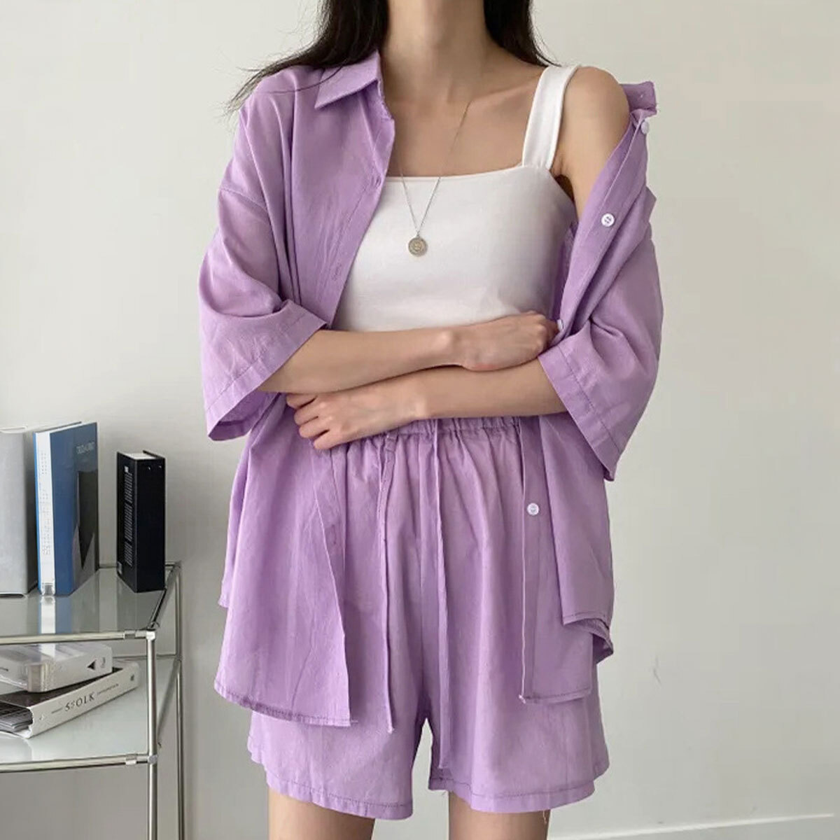半袖のロングシャツとハイウエストのショートパンツがセットになっていて、大人女子の春夏スタイルにぴったりです。