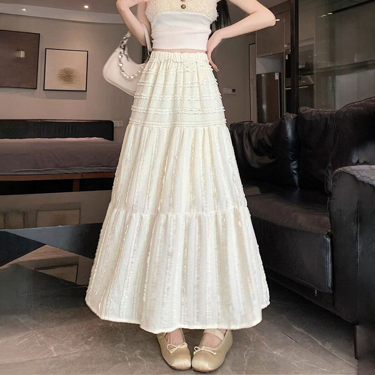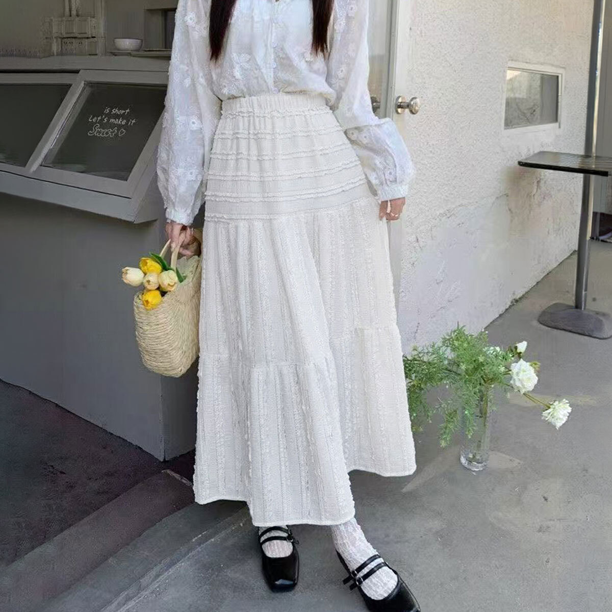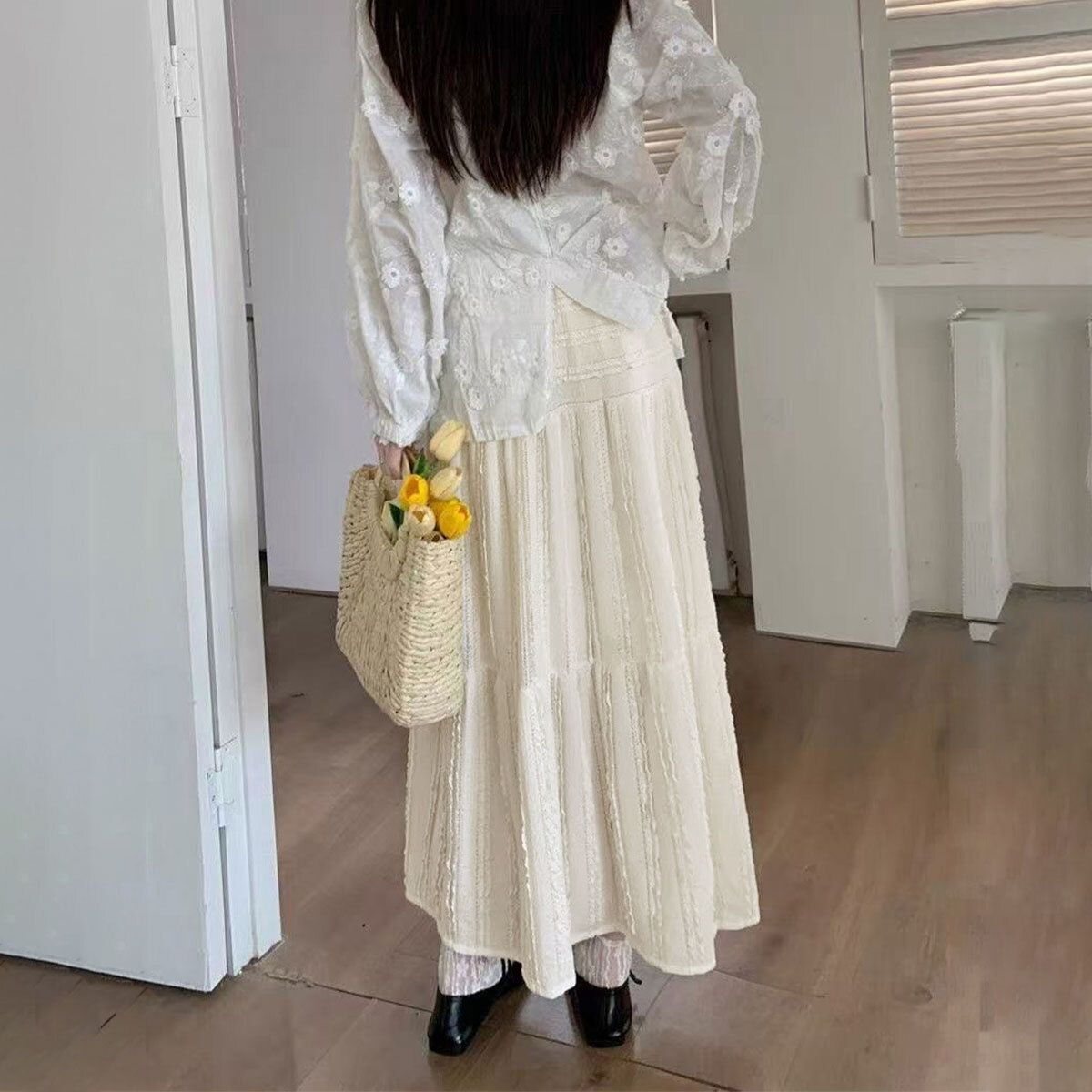 フリルとレースのティアードが重なりが、優雅さと可愛らしさを演出してくれるロングスカートです。