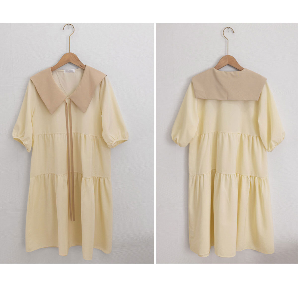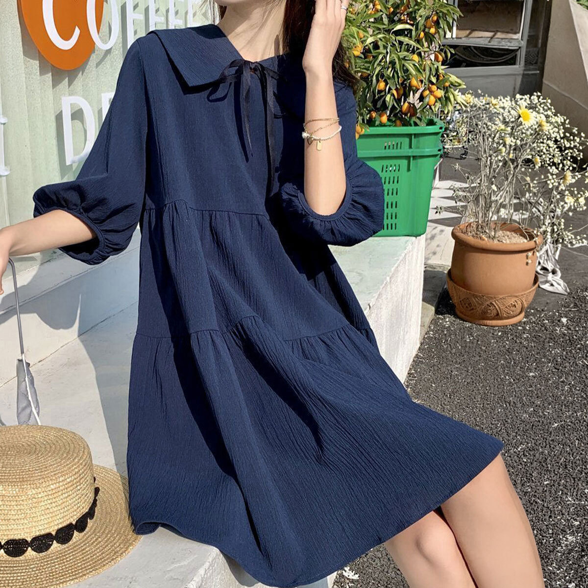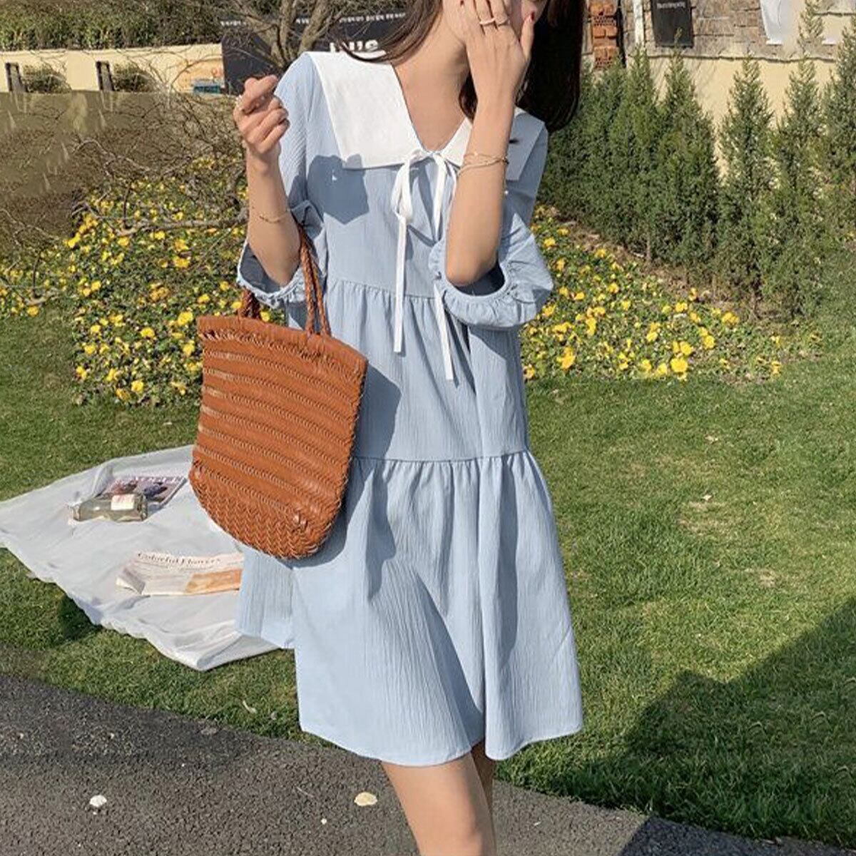 大きめの襟デザインとリボンが、女の子らしいフェミニンな印象を引き立て、1枚着るだけで韓国風のオルチャンスタイルが叶う、チュニックワンピースです。