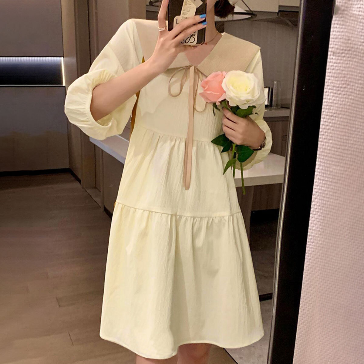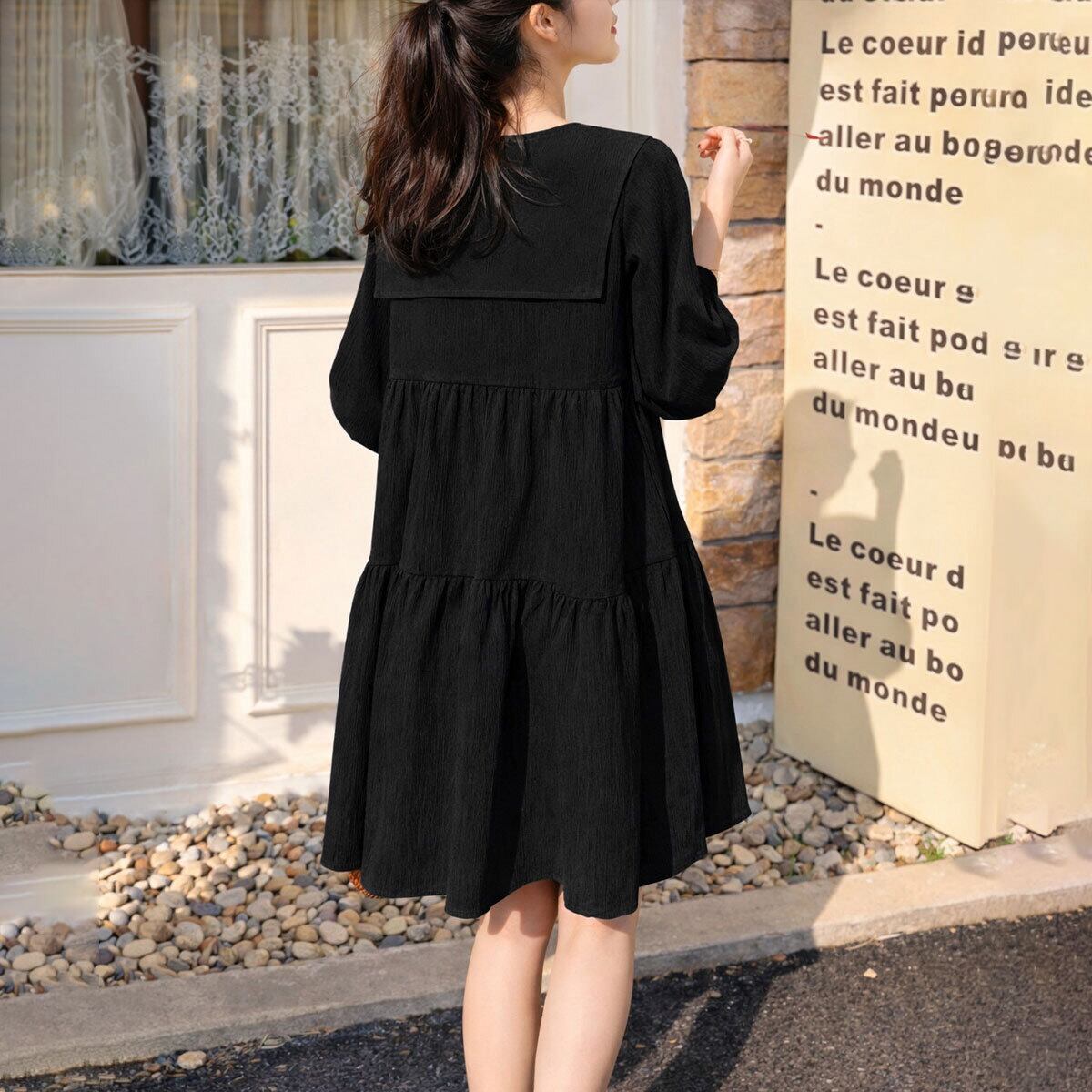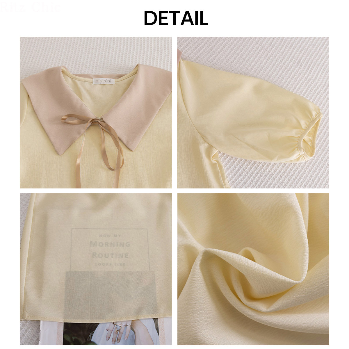 大きめの襟デザインとリボンが、女の子らしいフェミニンな印象を引き立て、1枚着るだけで韓国風のオルチャンスタイルが叶う、チュニックワンピースです。