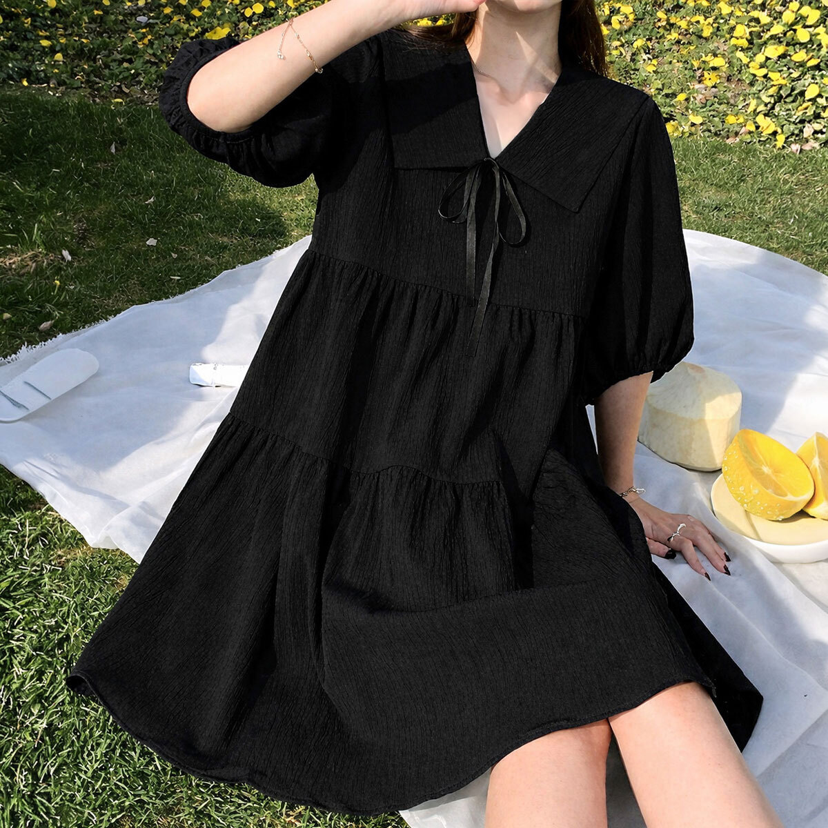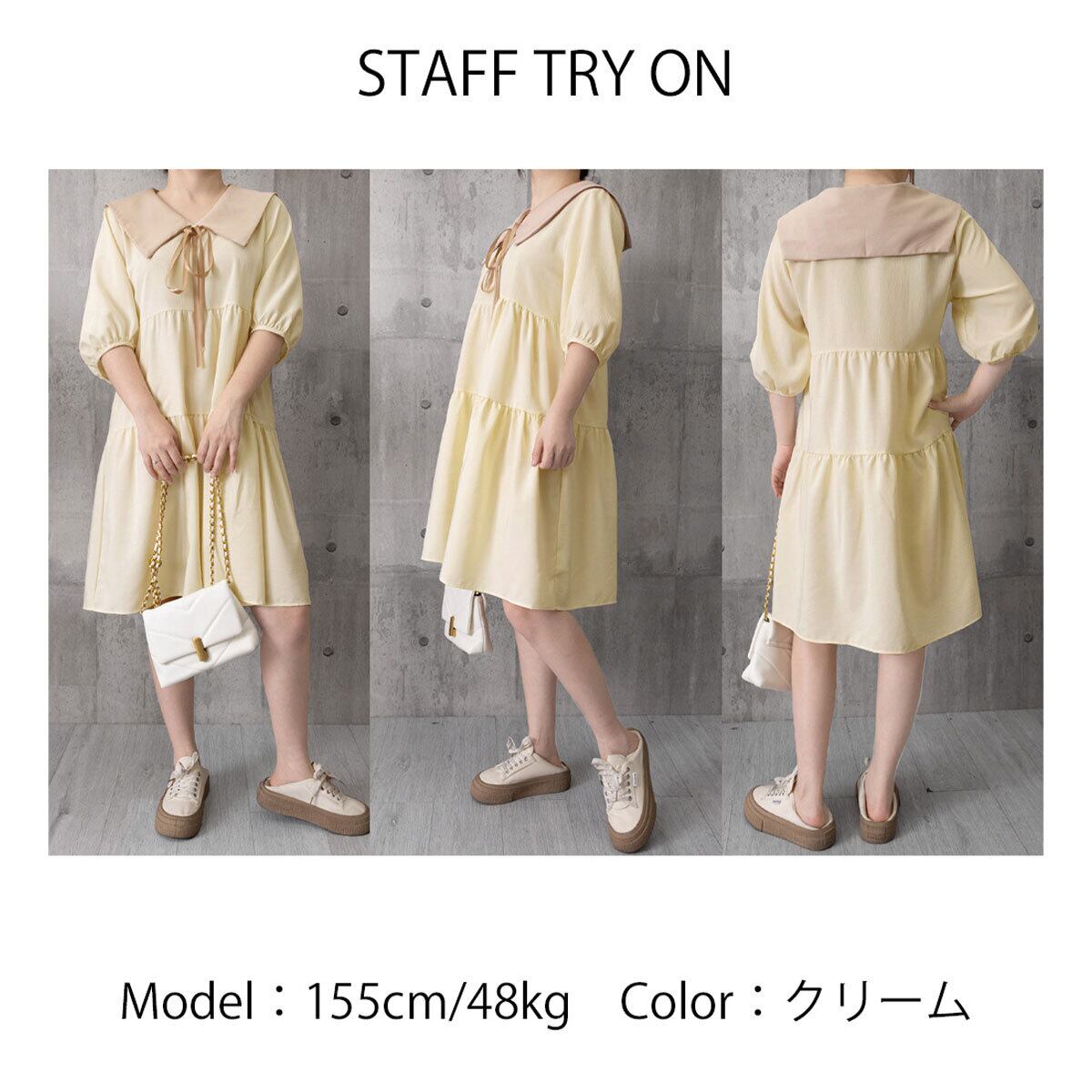 ◇大きな襟とリボンが目を引くティアードミニワンピース。