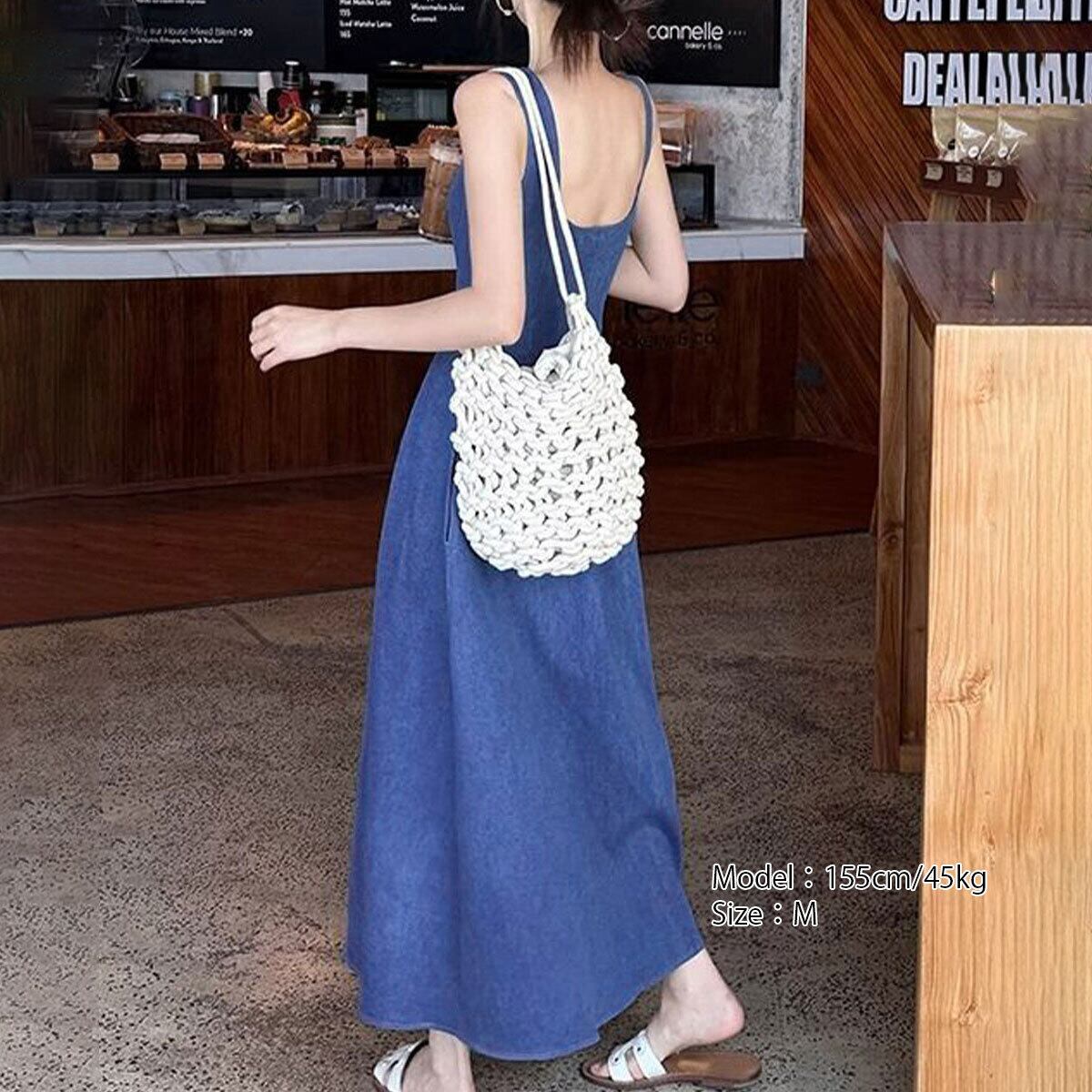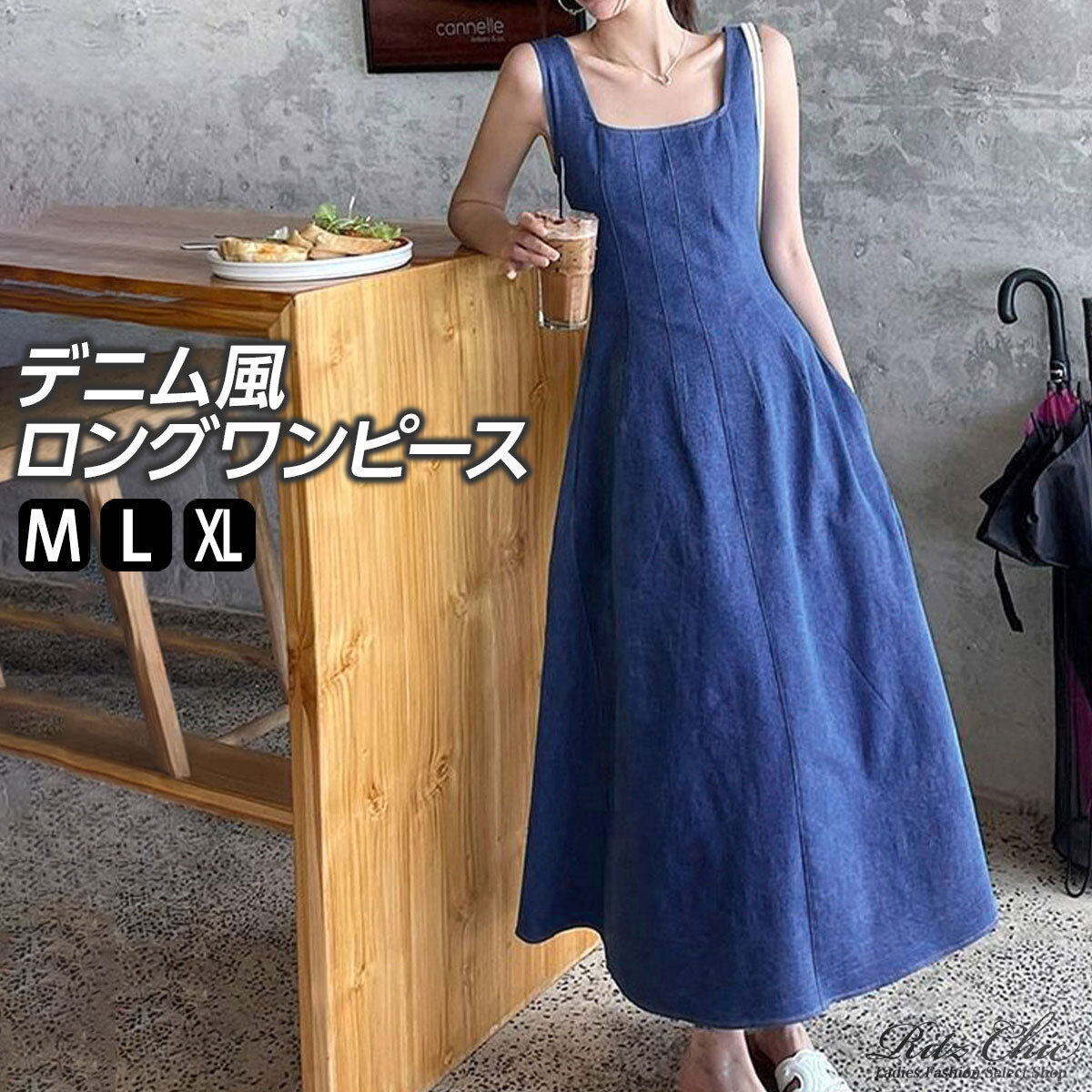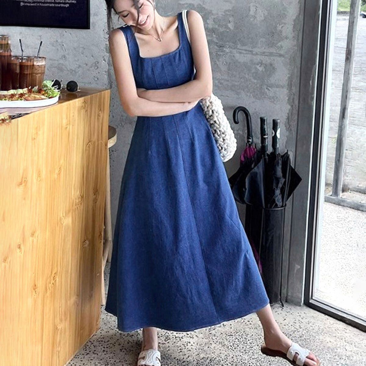 デニム風 ロングワンピース ノースリーブ レディース 春夏 韓国 ワンピース きれいめ 大人 カジュアル おしゃれ シンプル ミモレ丈 スクエアネック 上品 体型カバー 大人可愛い 大人女子