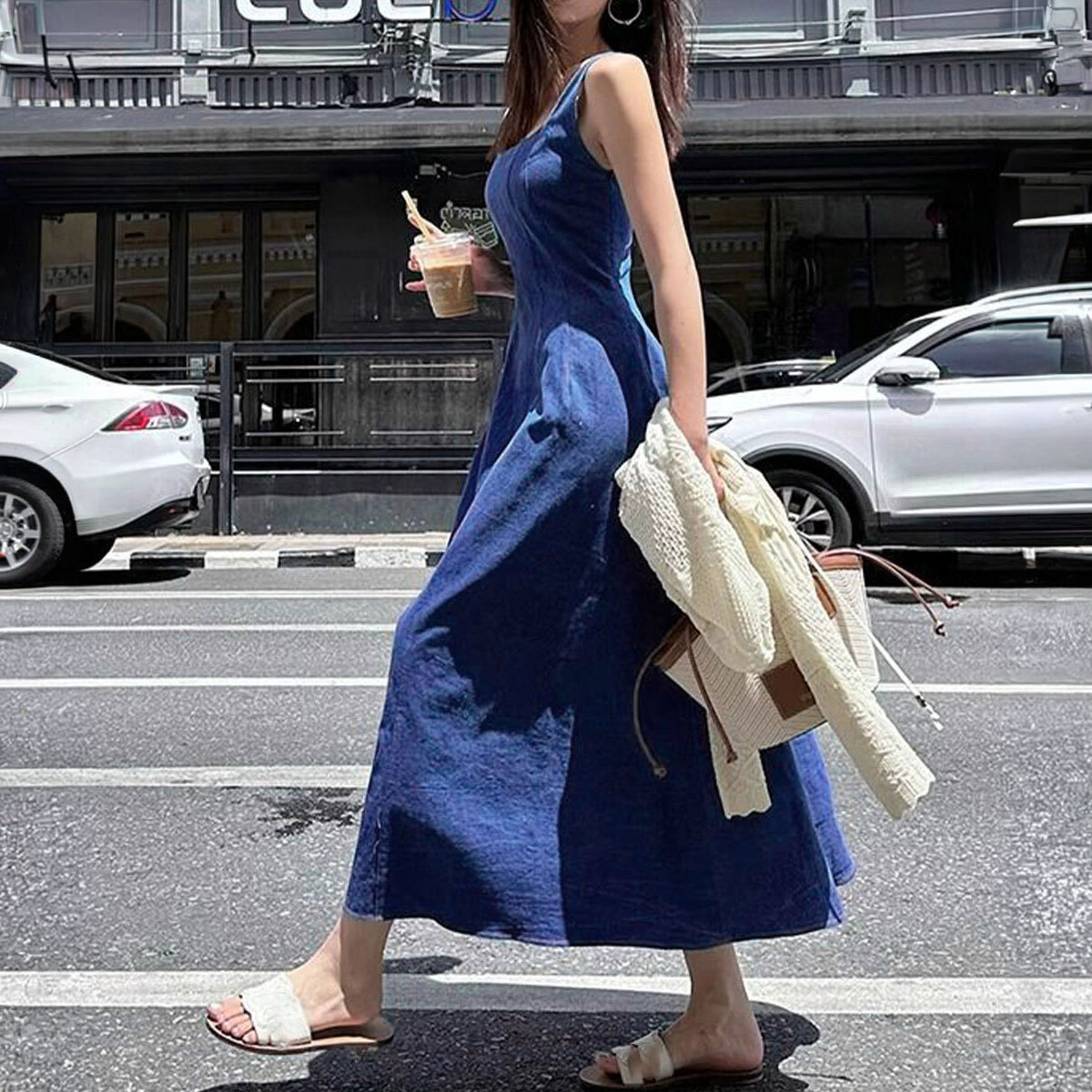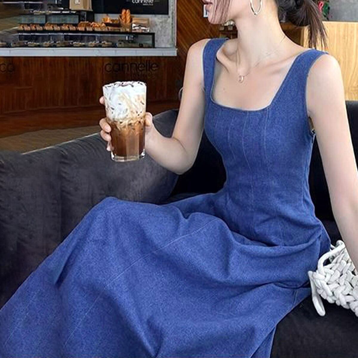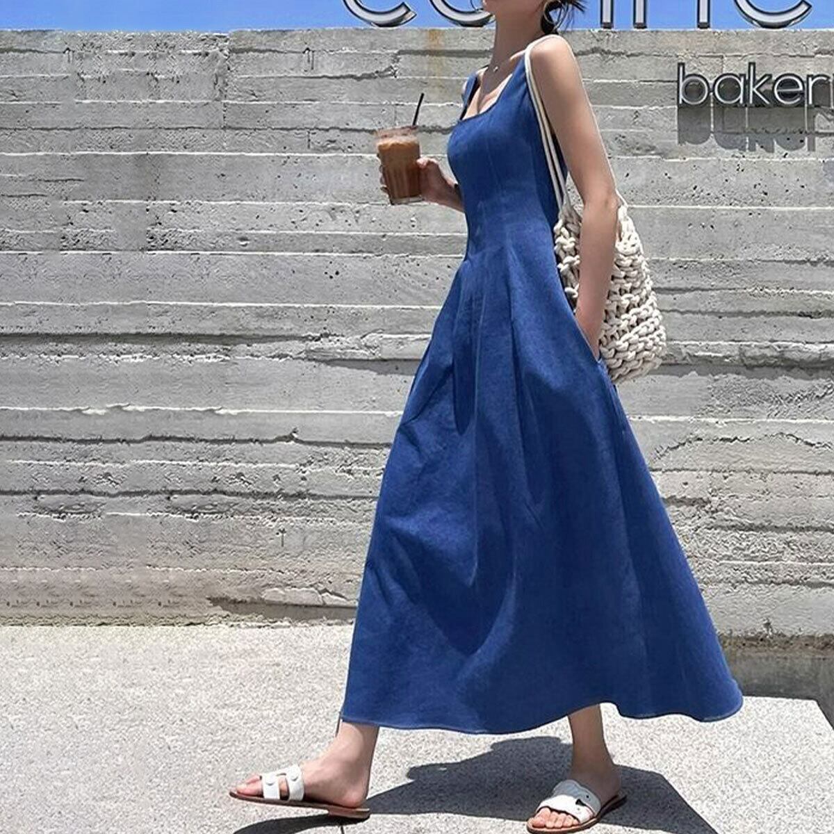 デニム風 ロングワンピース ノースリーブ レディース 春夏 韓国 ワンピース きれいめ 大人 カジュアル おしゃれ シンプル ミモレ丈 スクエアネック 上品 体型カバー 大人可愛い 大人女子