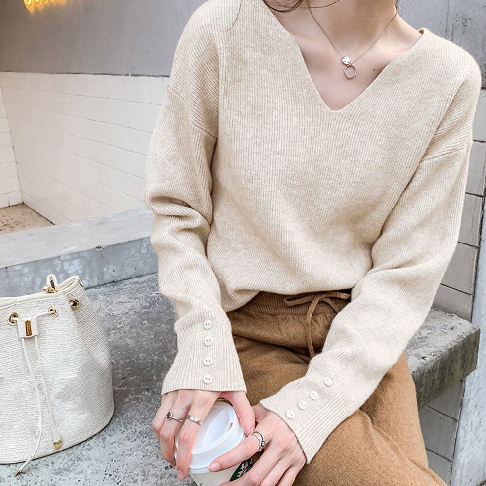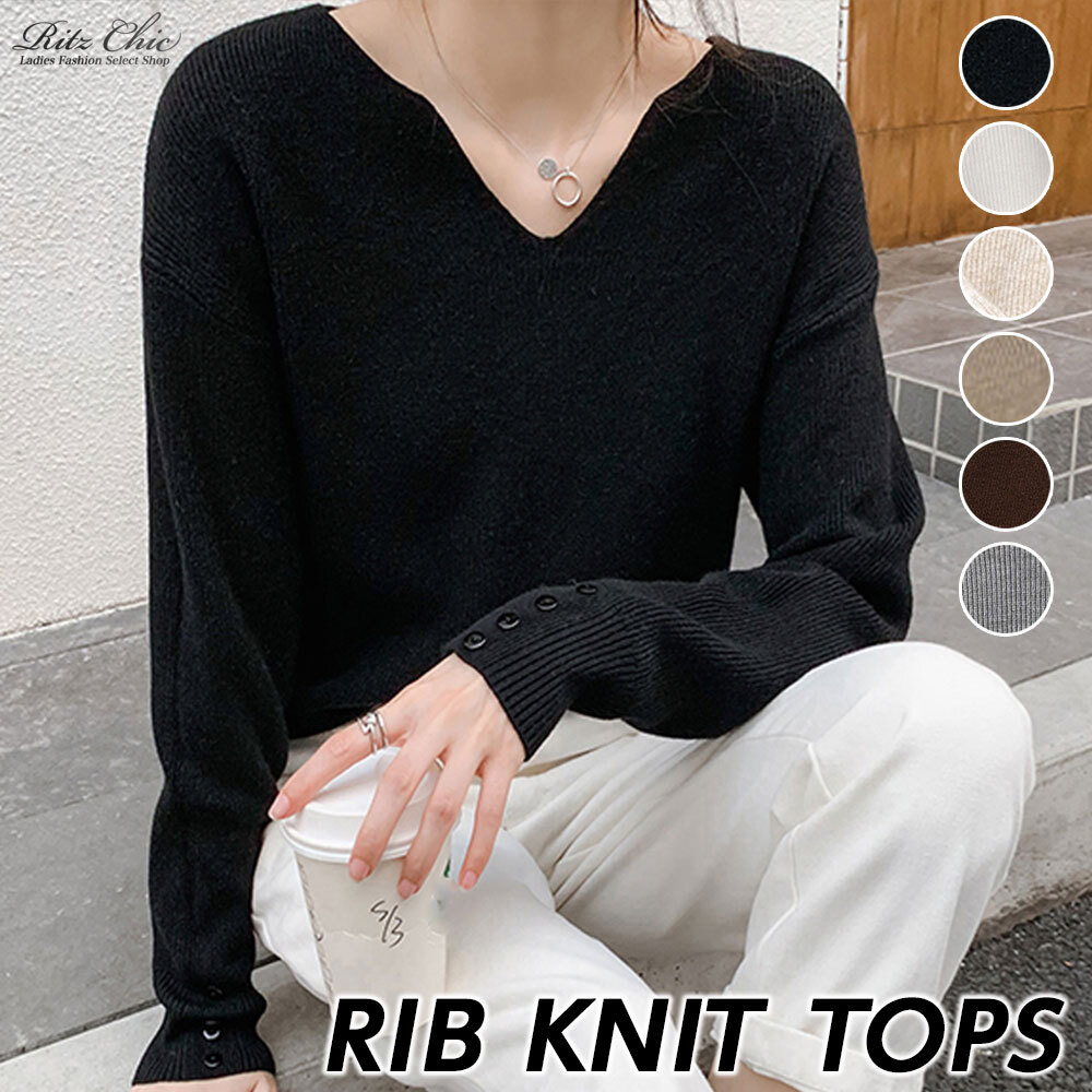 ニット Vネック レディース 長袖 トップス 秋冬 韓国 きれいめ シンプル 大人 カジュアル リブニット 無地 袖ボタン おしゃれ 柔らかい 暖かい 大人可愛い 大人女子