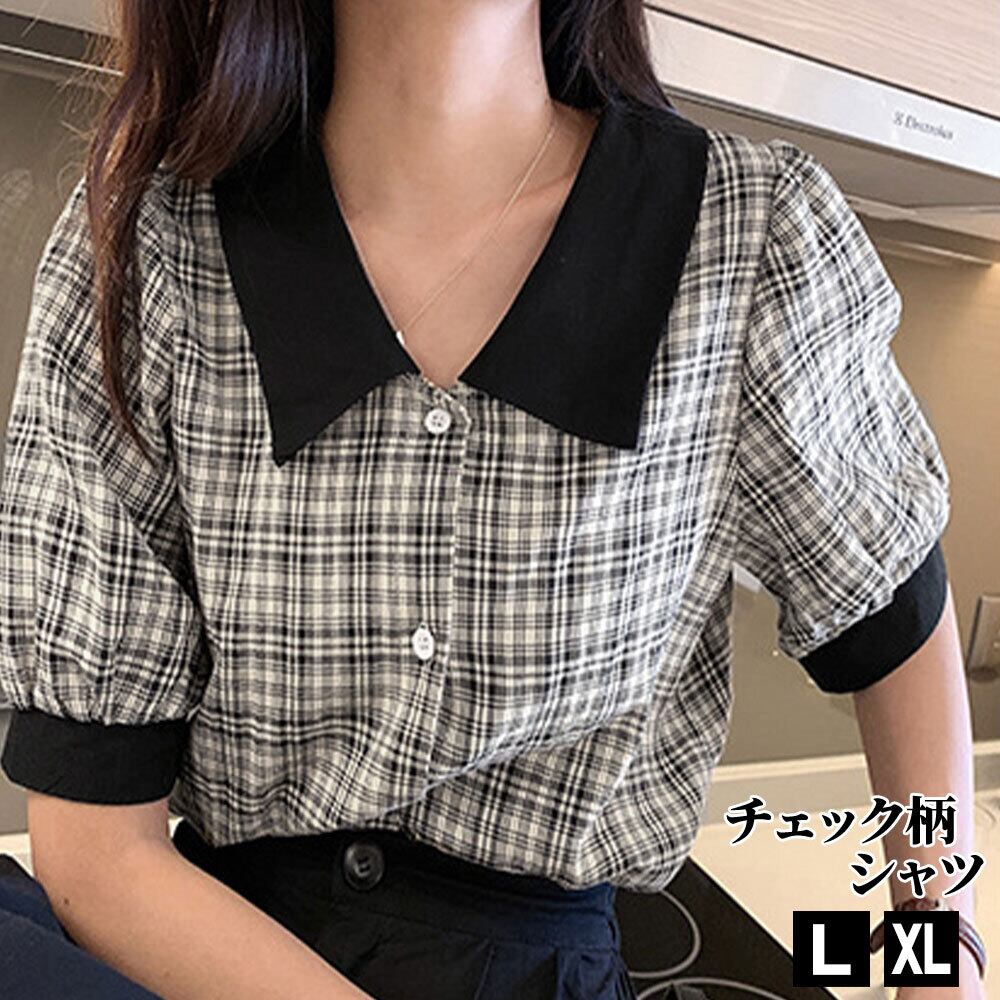 グレンチェック シャツ レディース 春夏 韓国 パフスリーブ トップス 大人 かわいい きれいめ おしゃれ ビジネス オフィス カジュアル 大人可愛い 大人女子