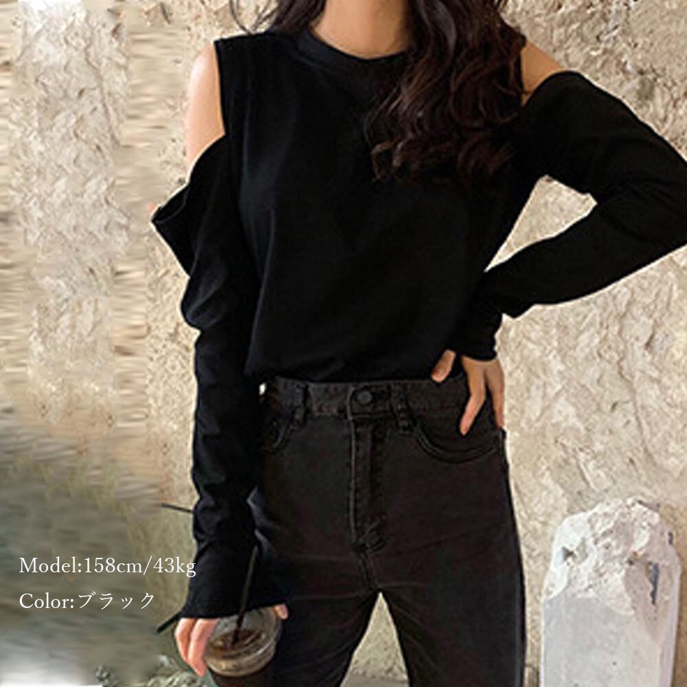 オープンショルダーデザインで、トレンドの肩出しコーデを楽しんでいただけるレディースの長袖Tシャツです。
