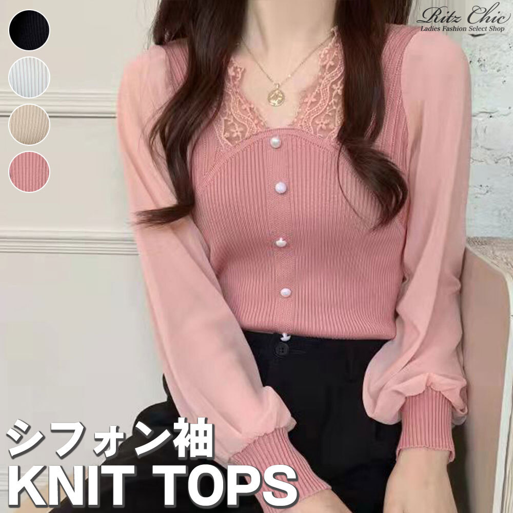 シフォン袖 ニット レディース 春秋 韓国 透け感 きれいめ 大人 かわいい フェミニン おしゃれ 異素材 切り替え リブニット トップス 大人可愛い 大人女子