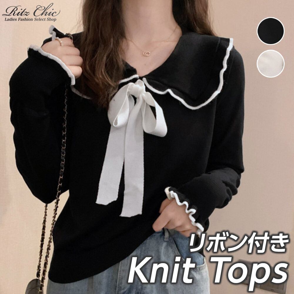 リボン ニット 長袖 レディース 春秋 韓国 おしゃれ 折り襟 ガーリー 大人 フェミニン かわいい きれいめ トップス ゆったり ニットソー 大人可愛い 大人女子