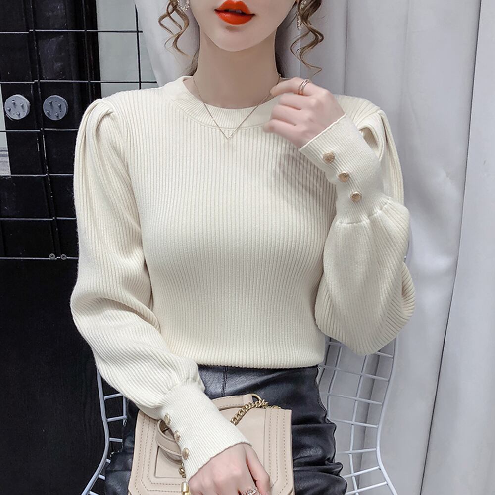 シンプルなリブニットトップスの袖口に、パールボタンを施して華やかなデザインに仕上げたレディースの長袖トップスです。