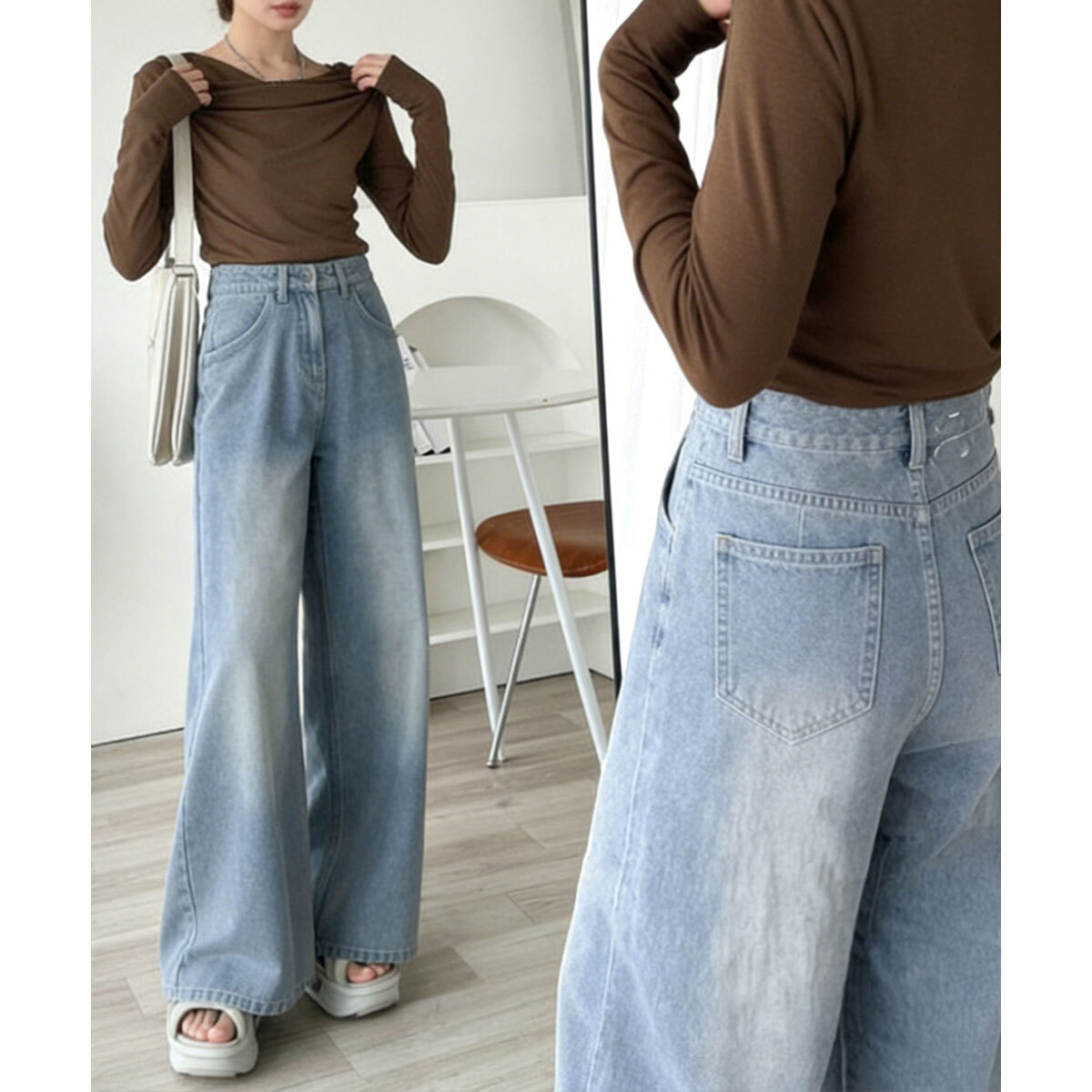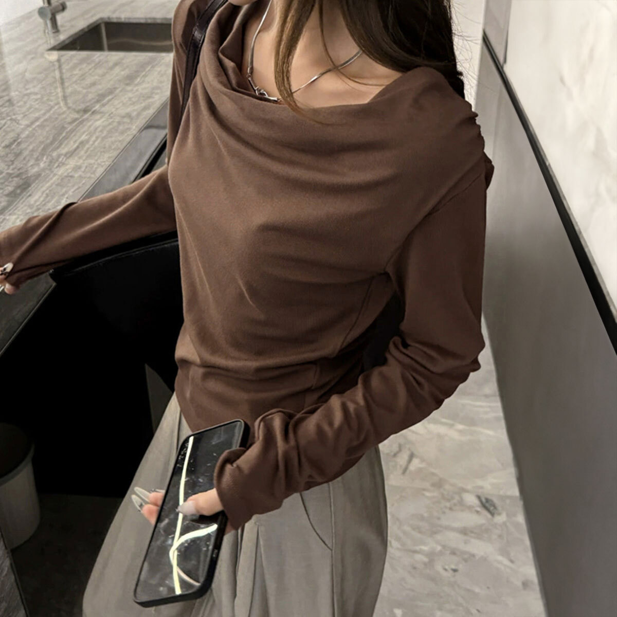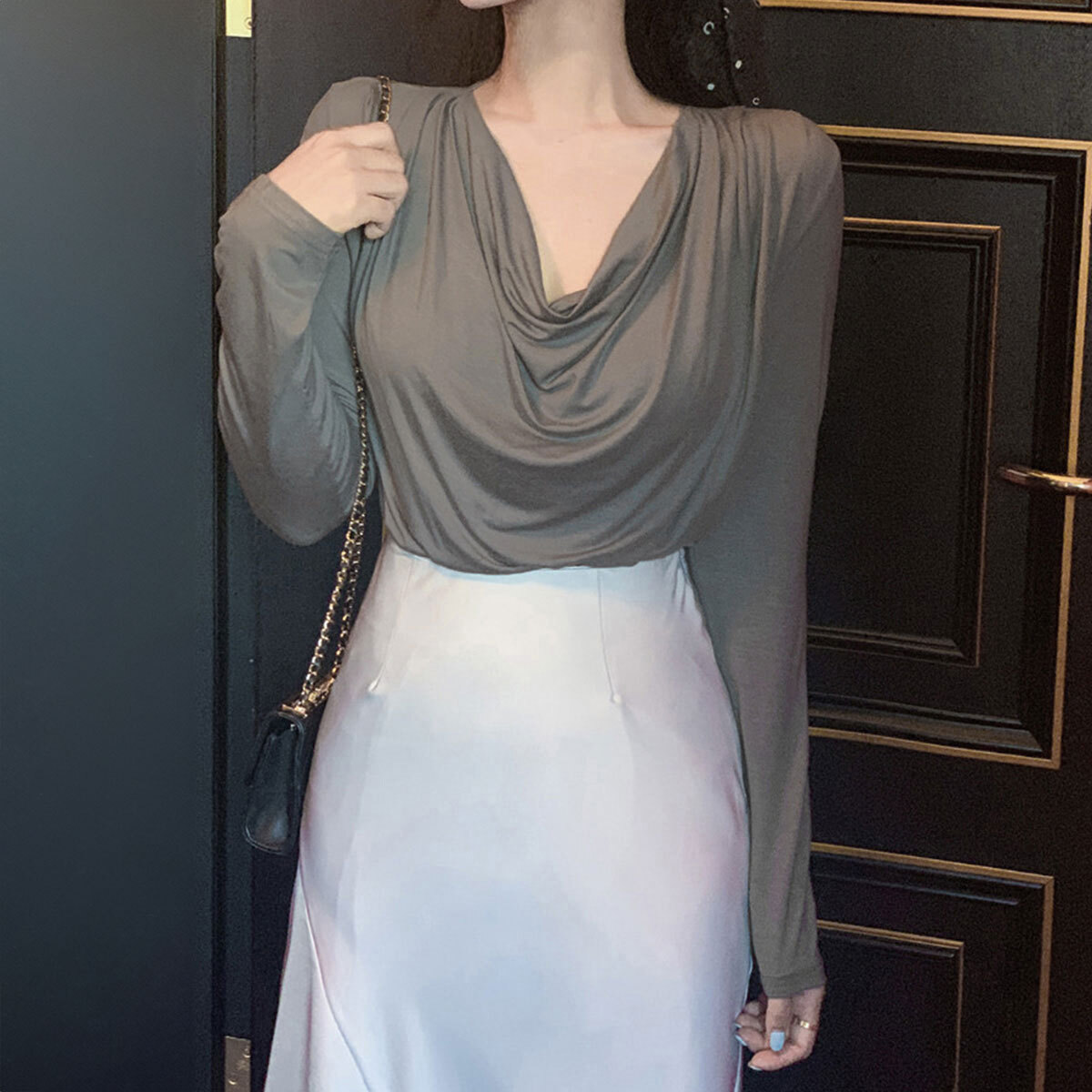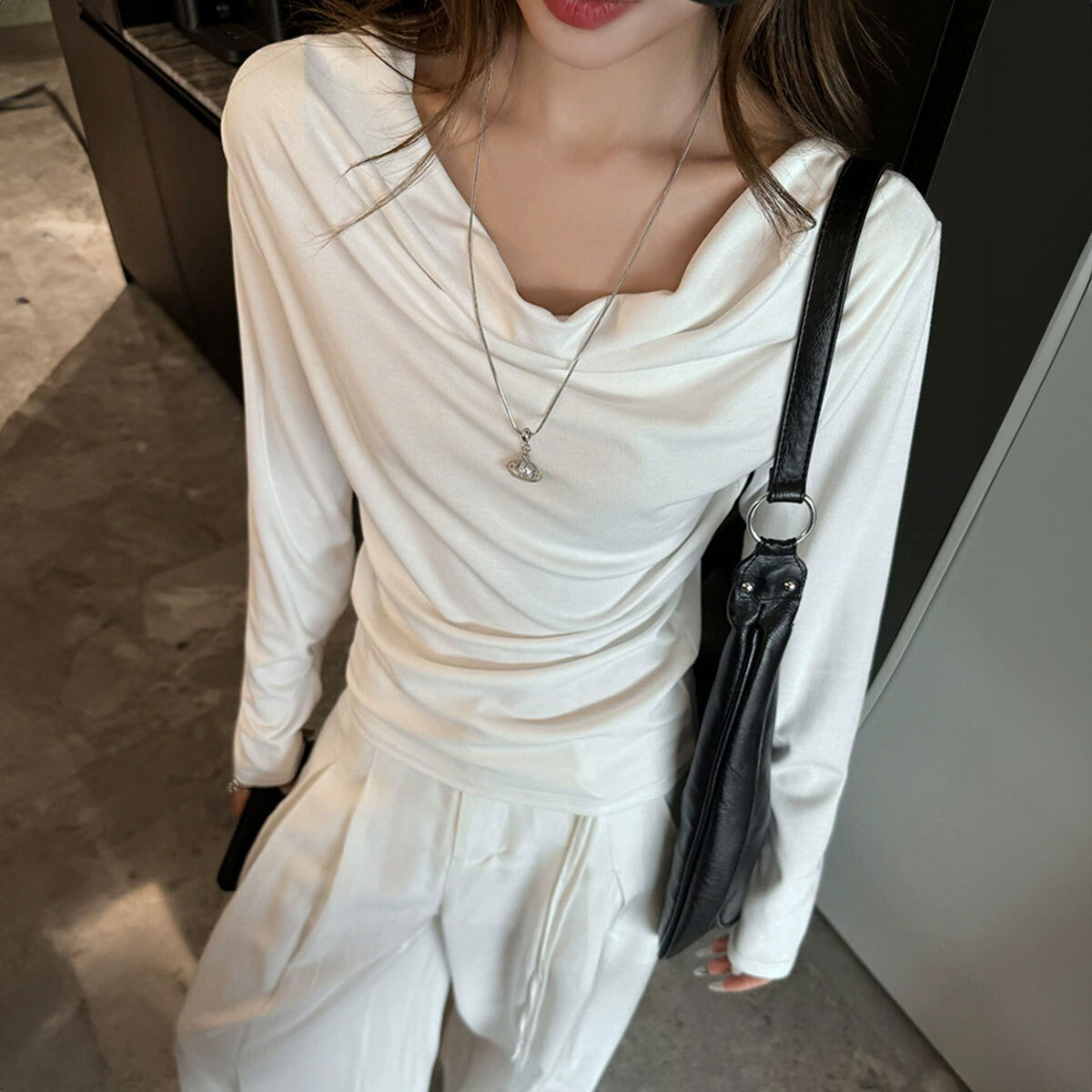 とろみのある素材感が抜け感と個性的な印象を与え、韓国スタイルのお洒落なコーディネートを楽しめるドレープネックの長袖Tシャツです。