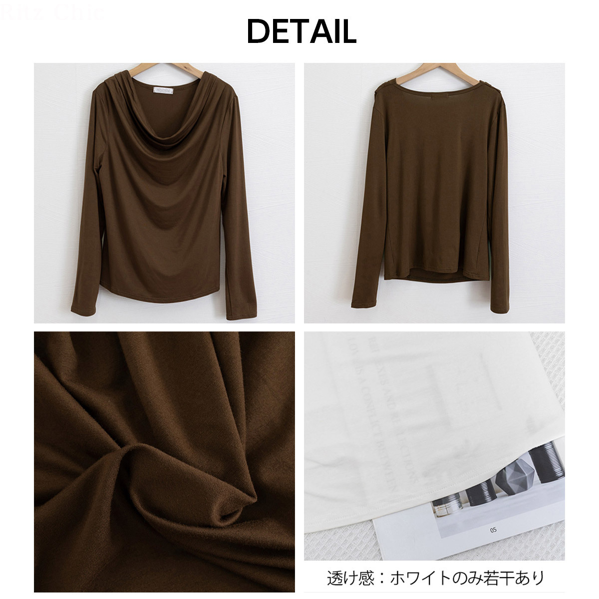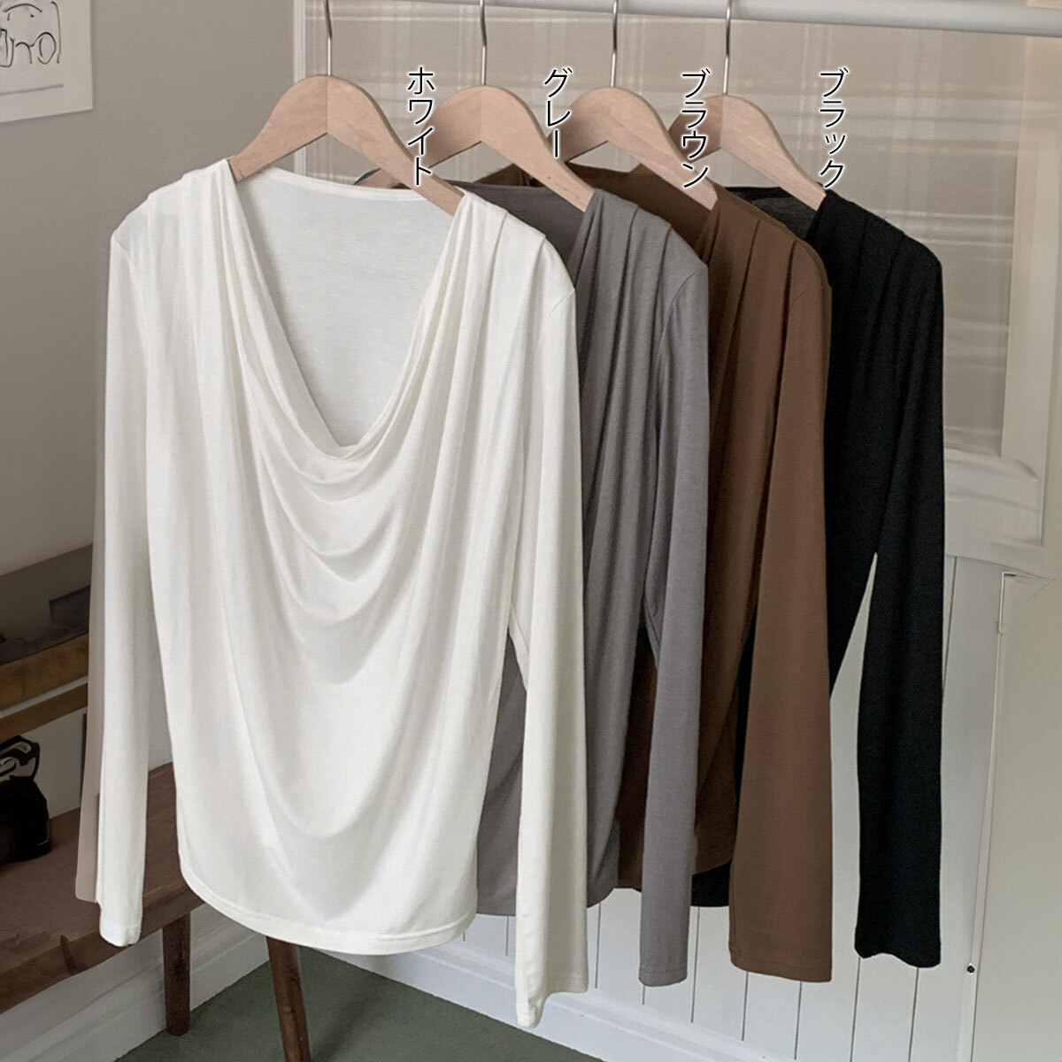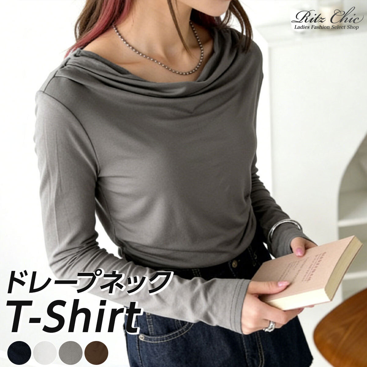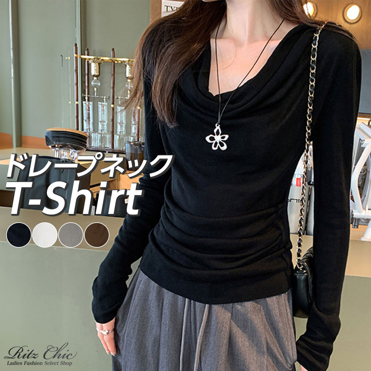ドレープ Tシャツ 長袖 レディース 春秋 トップス 韓国 大人 カジュアル きれいめ ストリート おしゃれ ドレープネック 無地 カットソー 大人可愛い 大人女子