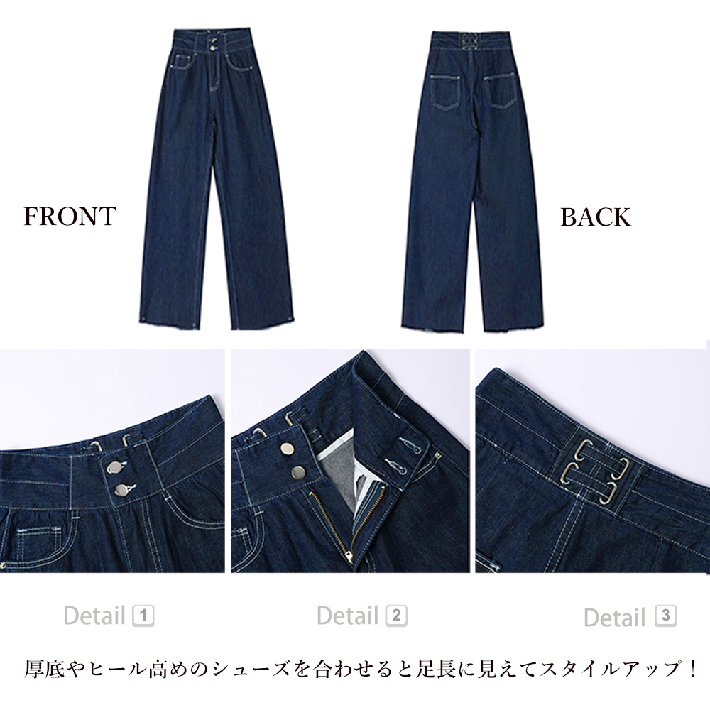 もちろん大きめのトップスと合わせても、女性らしい程よいルーズな着こなしで、韓国風のストリートファッションや、アメカジスタイルにも使いやすい大人女子にオススメのデニムワイドパンツです。