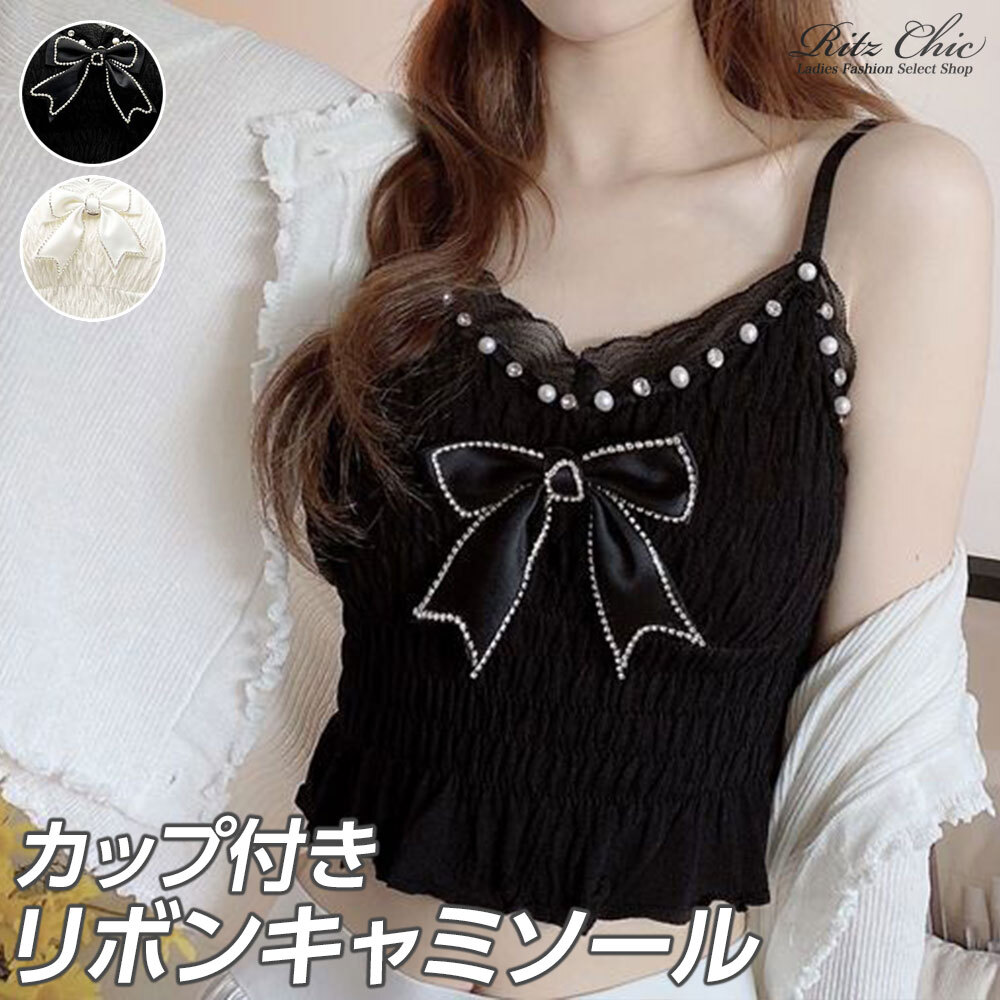 キラキラと輝くラインストーンと、上品で高見えしてくれるフェイクパールが、大人の女性らしさを演出し、フロントの大きなリボンで、可愛らしいフェミニンさをプラスしてくれるかプ付きのキャミソールです。