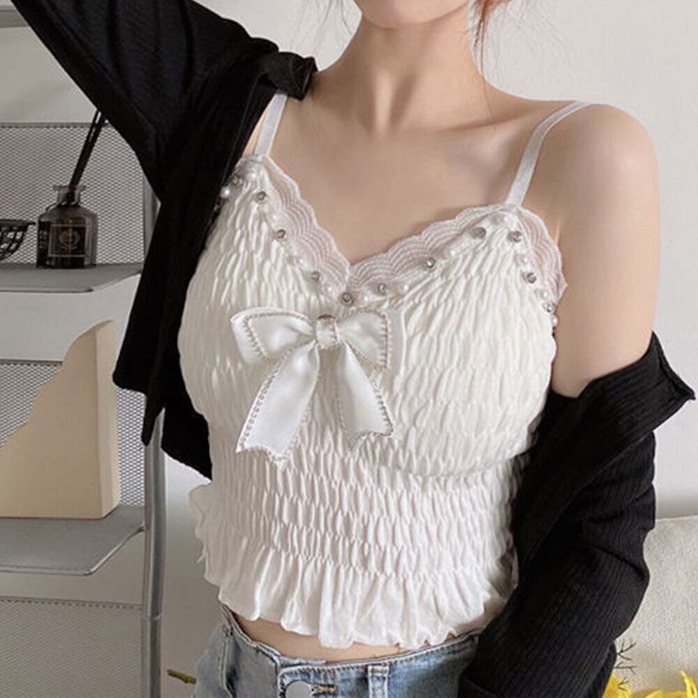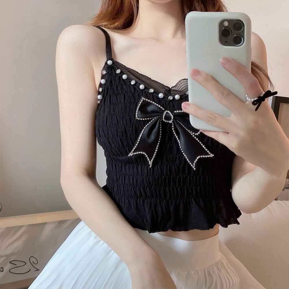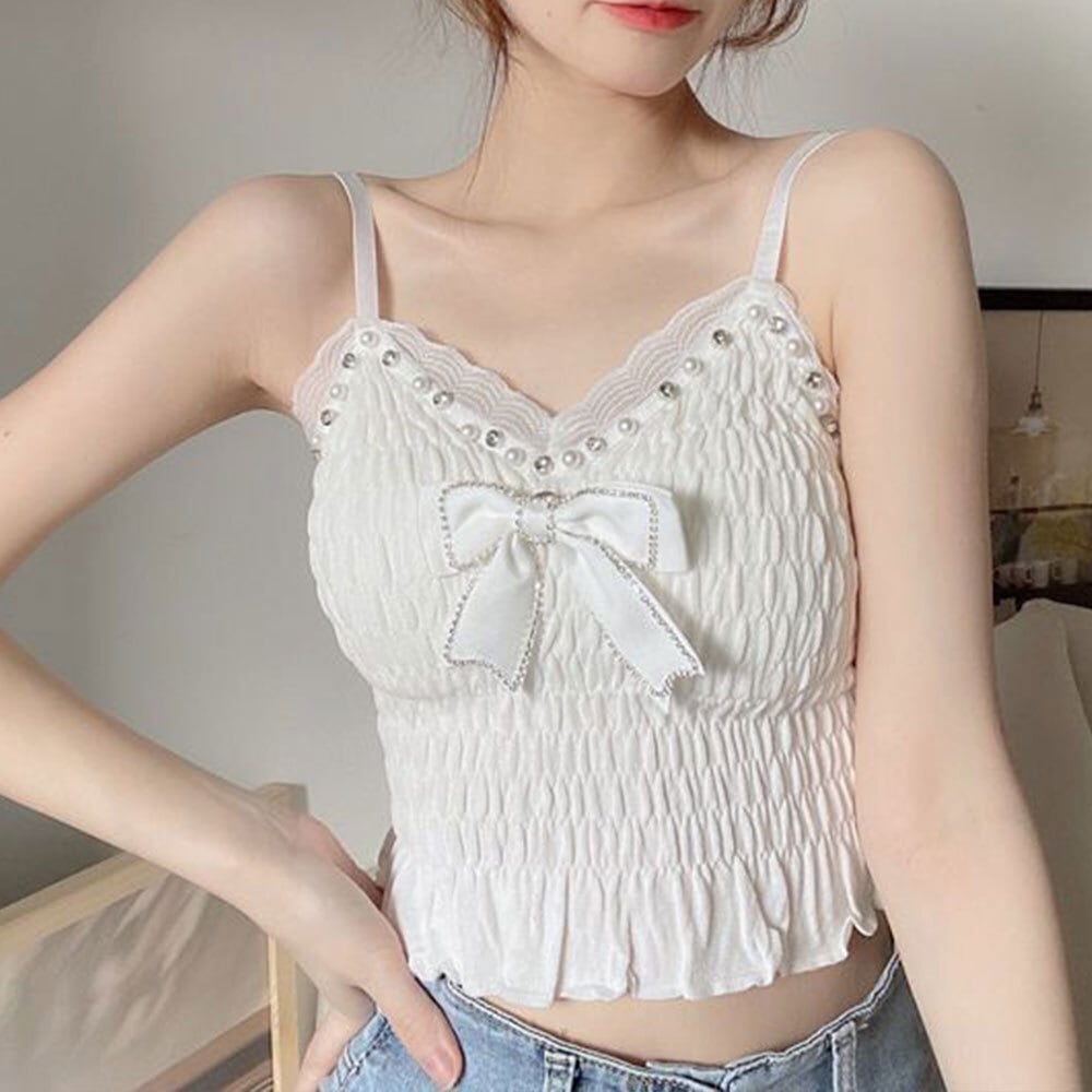 カップ付き リボン キャミソール レディース 春夏 韓国 へそ出し インナー トップス 大人 かわいい きれいめ おしゃれ フェミニン ストレッチ 重ね着 ショート丈 大人可愛い 大人女子
