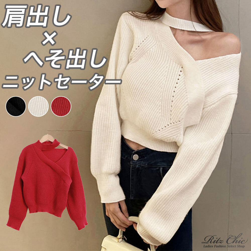 ショート丈 ニット セーター レディース 秋冬 韓国 肩出し へそ出し きれいめ 大人 かわいい フェミニン カジュアル おしゃれ ゆったり オフショルダー リブニット 大人可愛い 大人女子