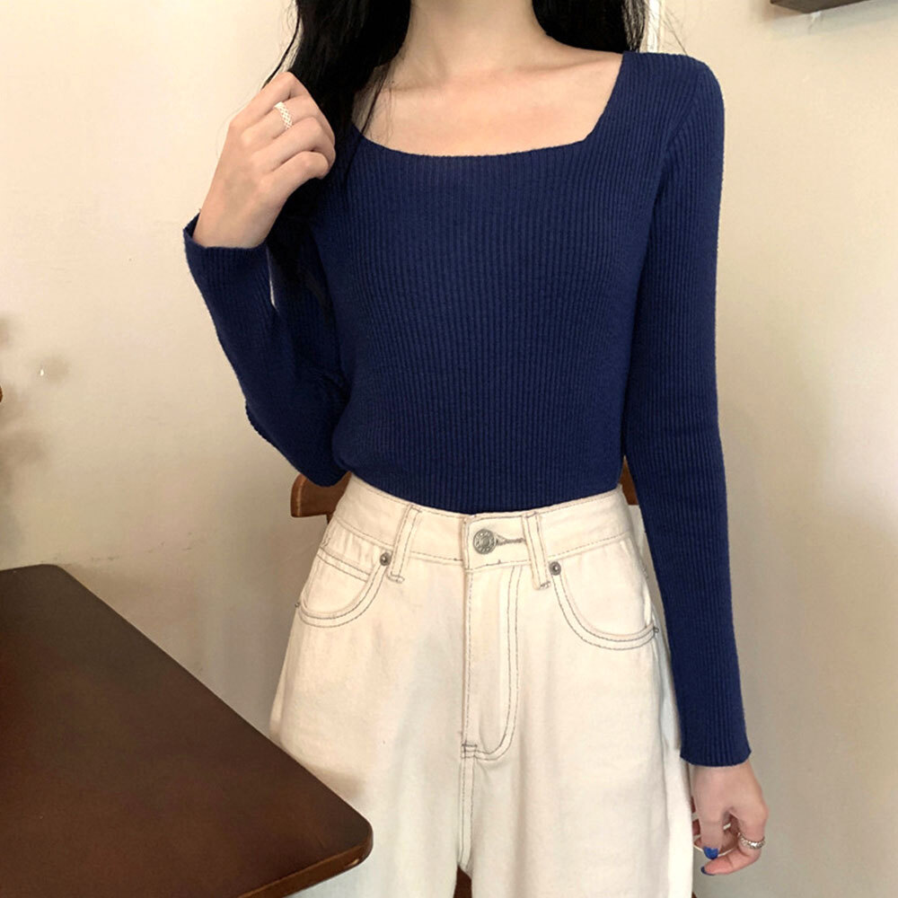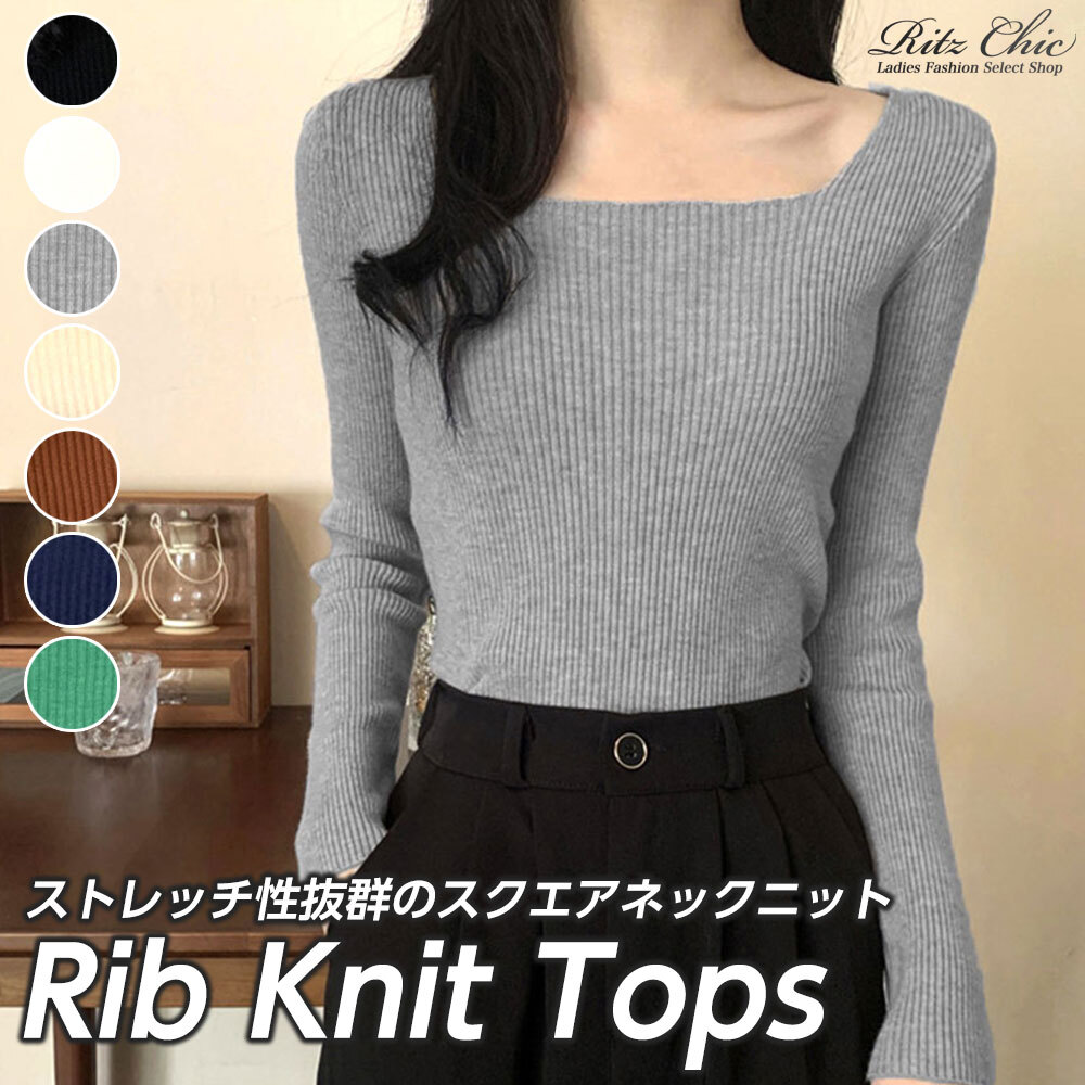 ニット スクエアネック 長袖 レディース 秋冬 韓国 リブニット ストレッチ きれいめ シンプル おしゃれ 大人 カジュアル インナー トップス 長袖ニット 大人可愛い 大人女子