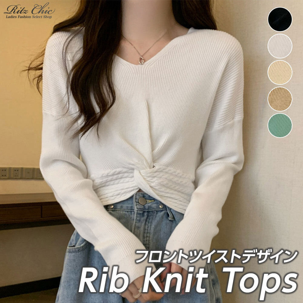 個性的なフロントツイストのデザインで周りの目を惹き、トレンド感のある着こなしを楽しめる長袖のリブニットトップスです。