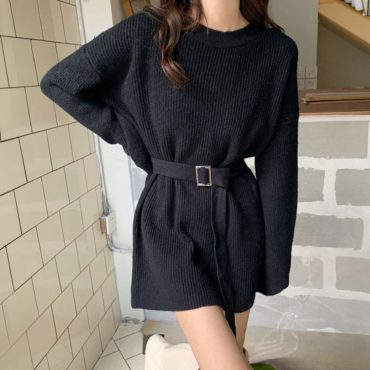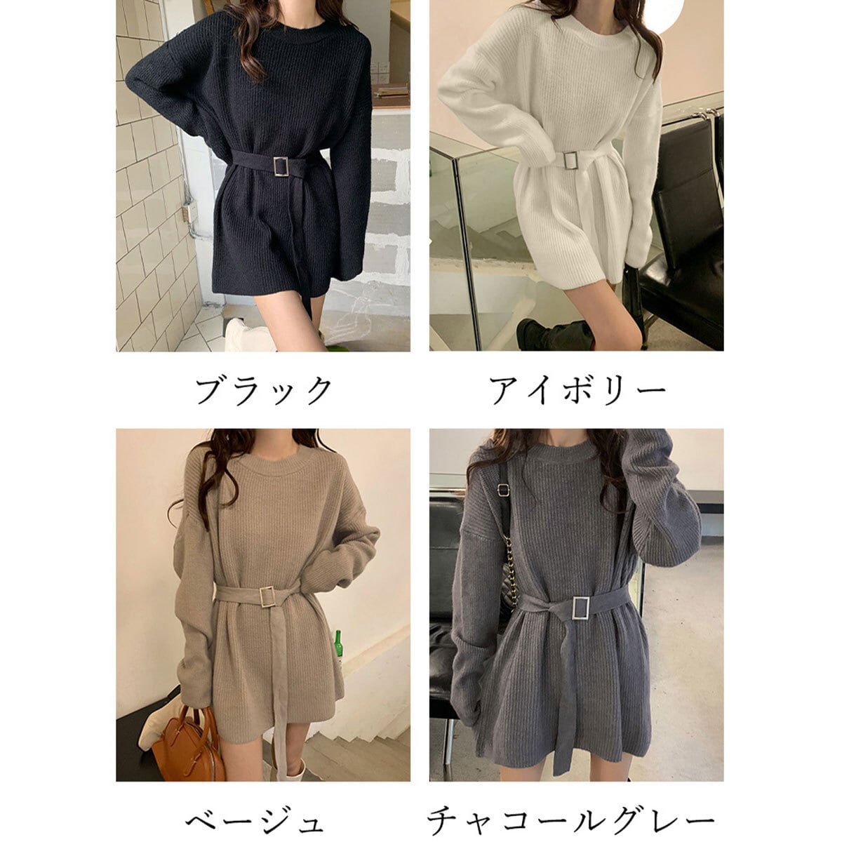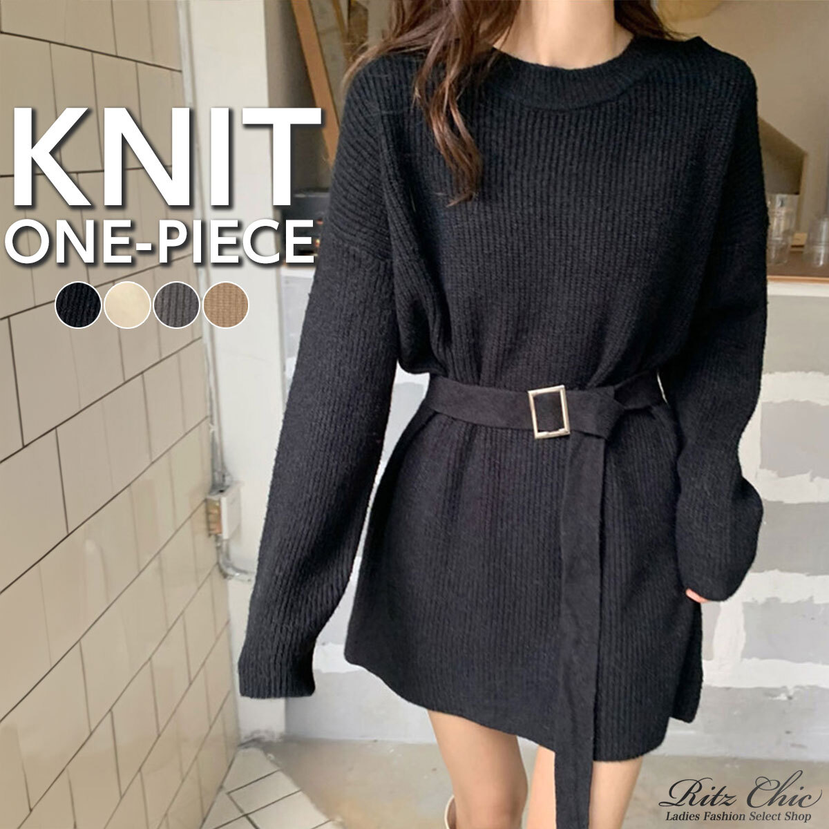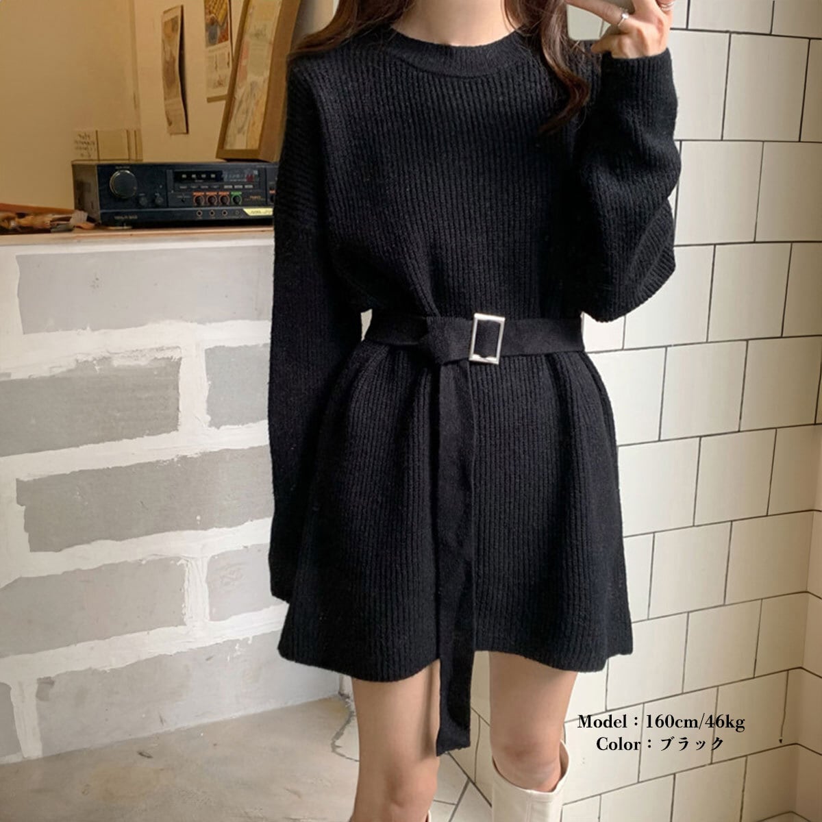 ミニワンピース ニット 長袖 レディース 秋冬 韓国 ワンピース きれいめ 大人 かわいい おしゃれ カジュアル ウエストマーク ベルト付き ゆったり 体型カバー 無地 シンプル 大人可愛い 大人女子