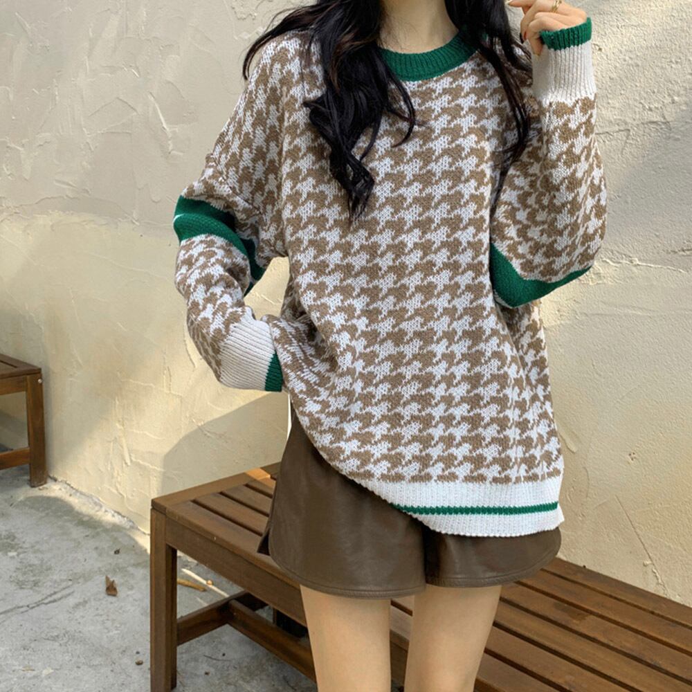 レトロな印象の千鳥格子柄デザインで、1枚着るだけでレトロ感のある秋冬コーデが完成してくれるお洒落で可愛いニットトップスです。