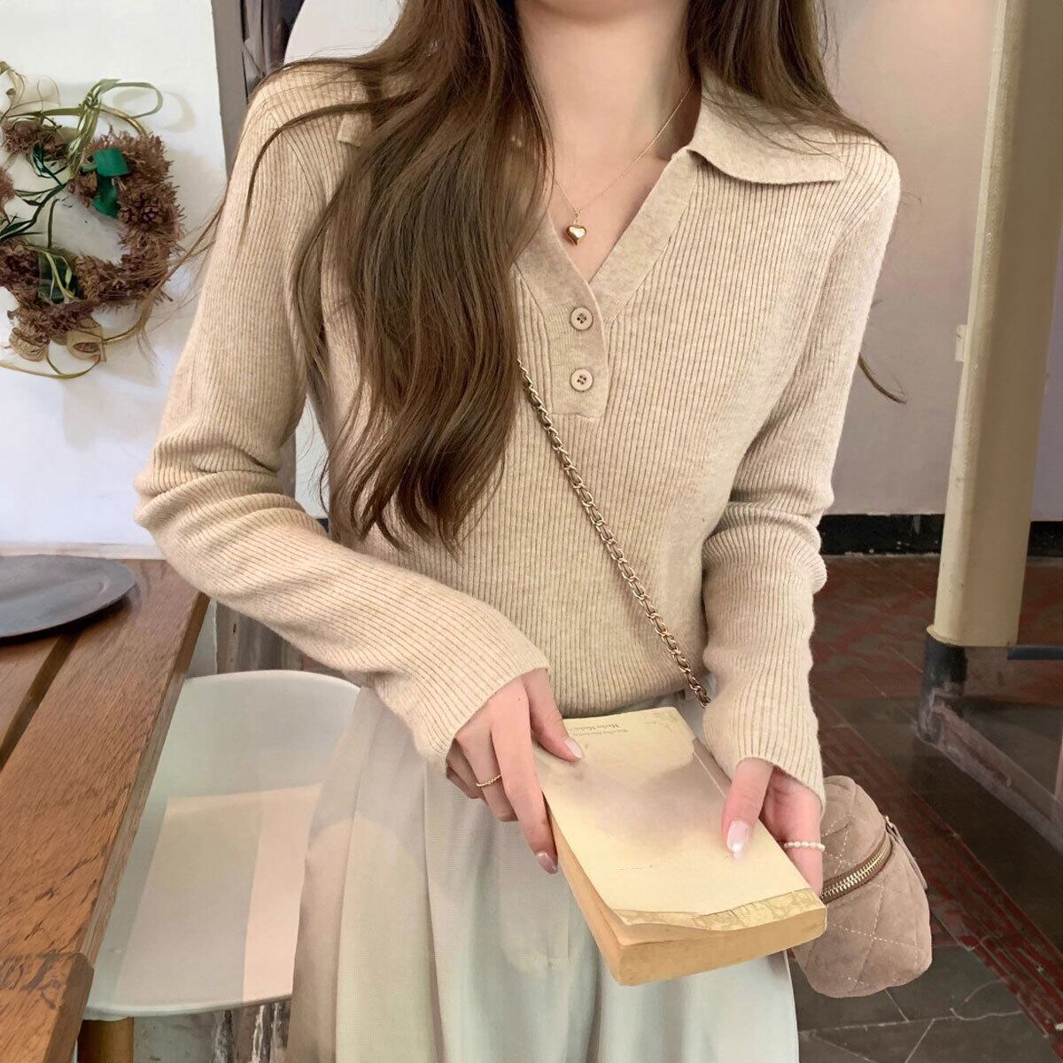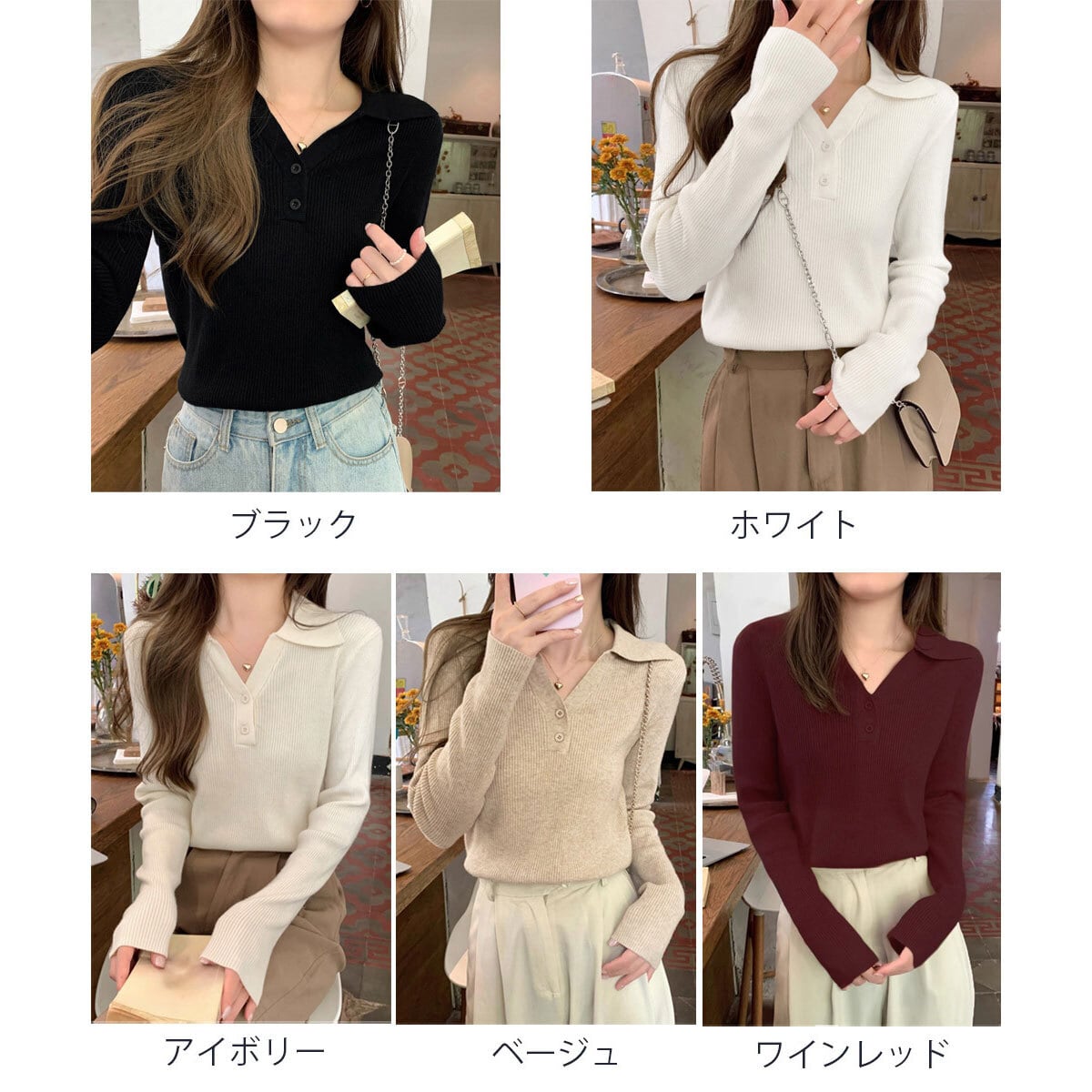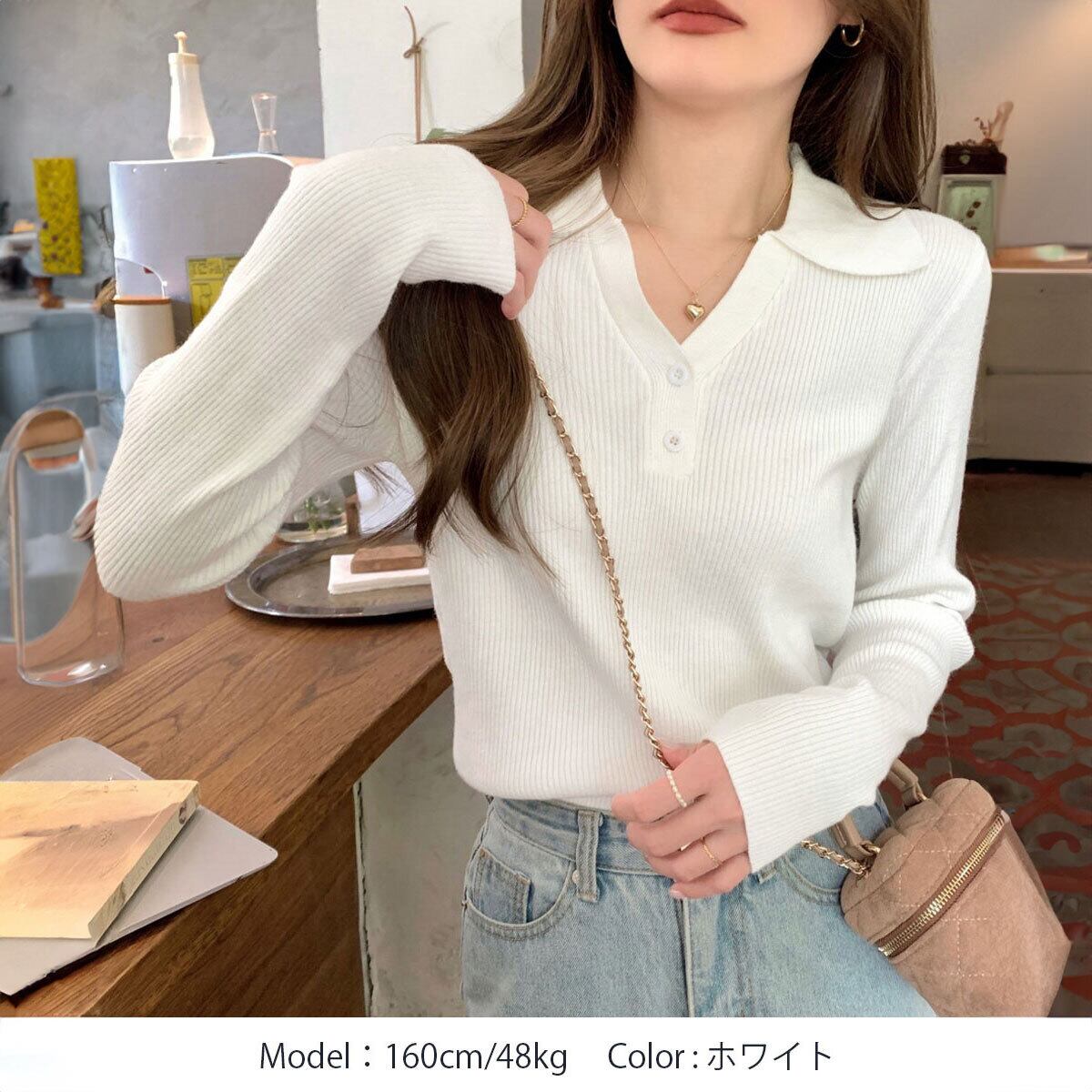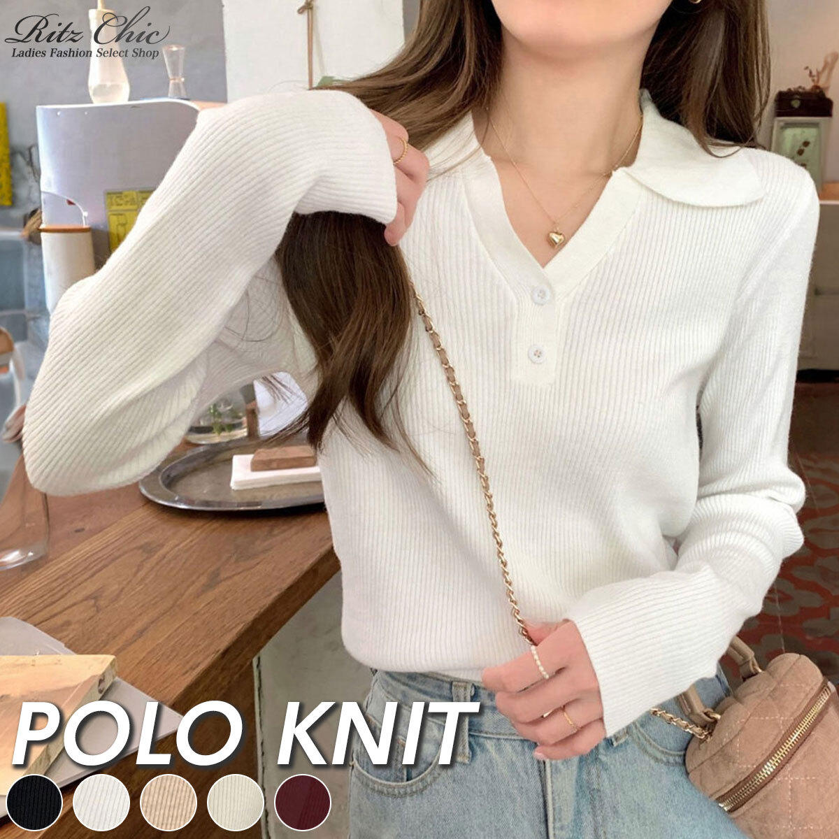 ポロ ニット 長袖 トップス レディース 春秋 韓国 リブニット きれいめ 大人 シンプル カジュアル オフィス ビジネス ニットセーター Vネック 大人可愛い 大人女子