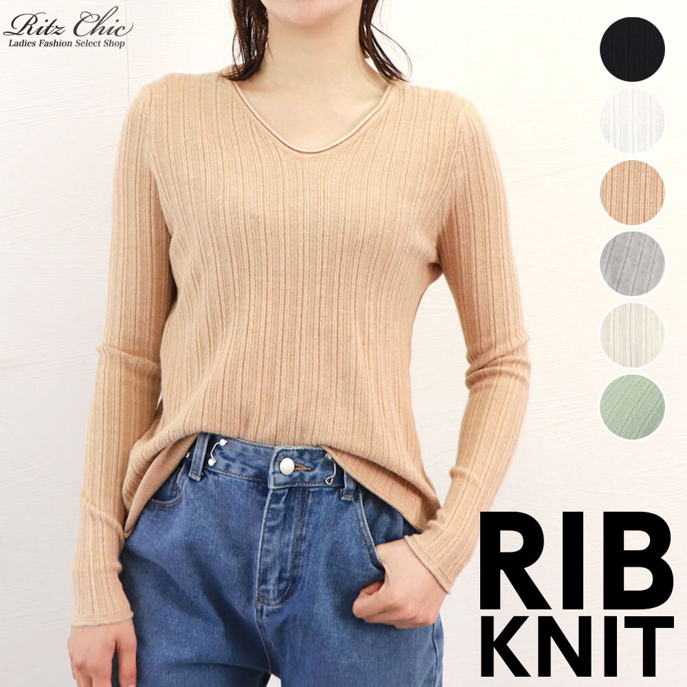 リブニット 長袖 Vネック レディース 春秋 韓国 ニット きれいめ シンプル 大人 カジュアル 薄手 無地 伸縮性 上品 オフィス ビジネス 大人可愛い 大人女子