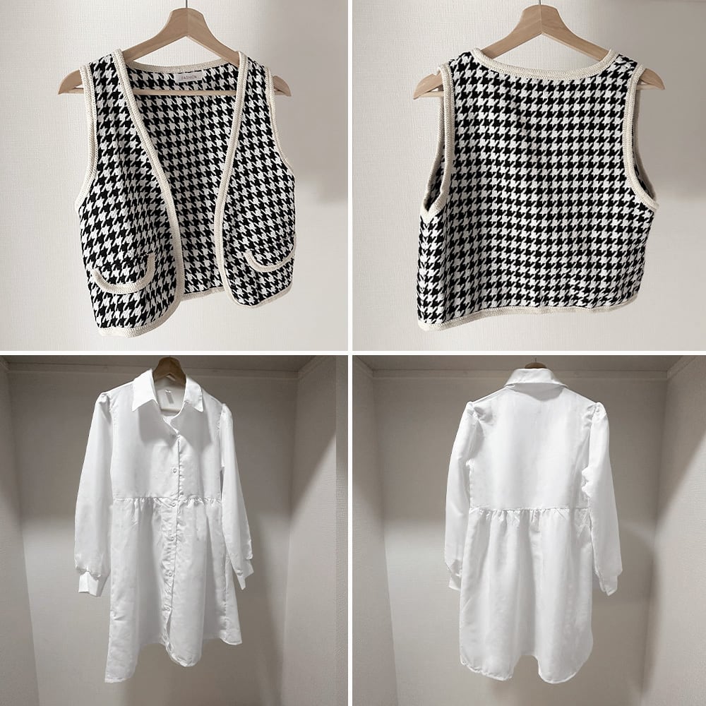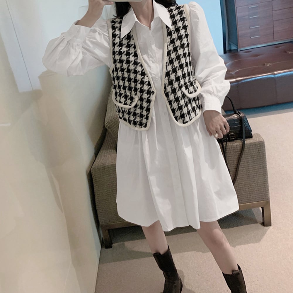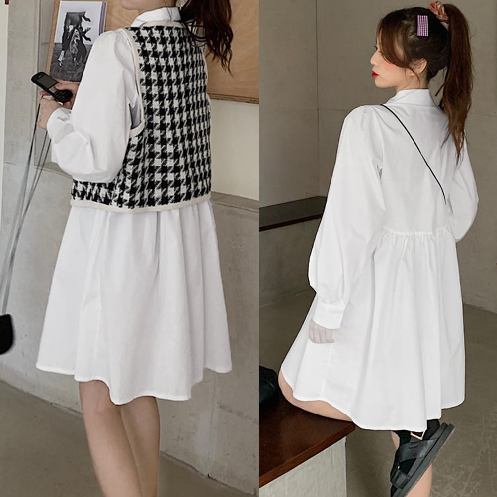 清楚できれいめなシャツワンピースと、千鳥柄がお洒落で可愛いベストがセットになった長袖ワンピースの2点セットです。