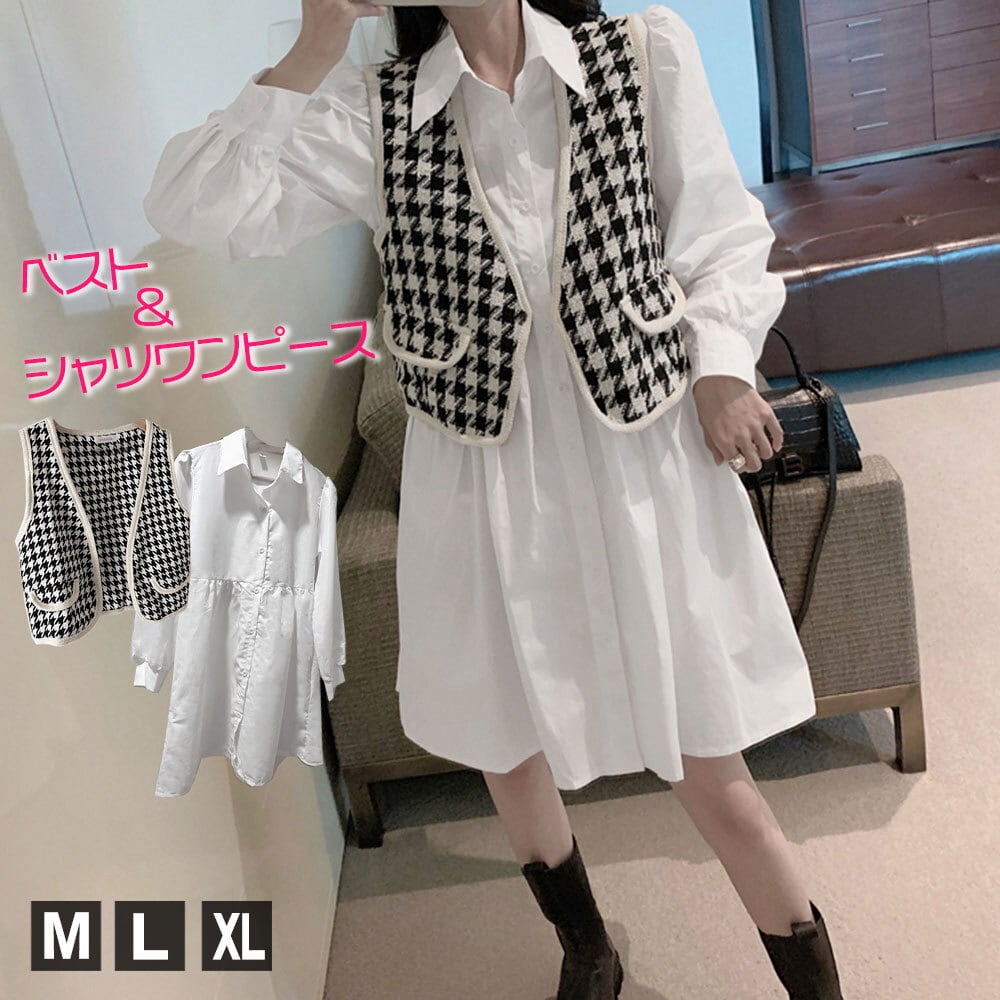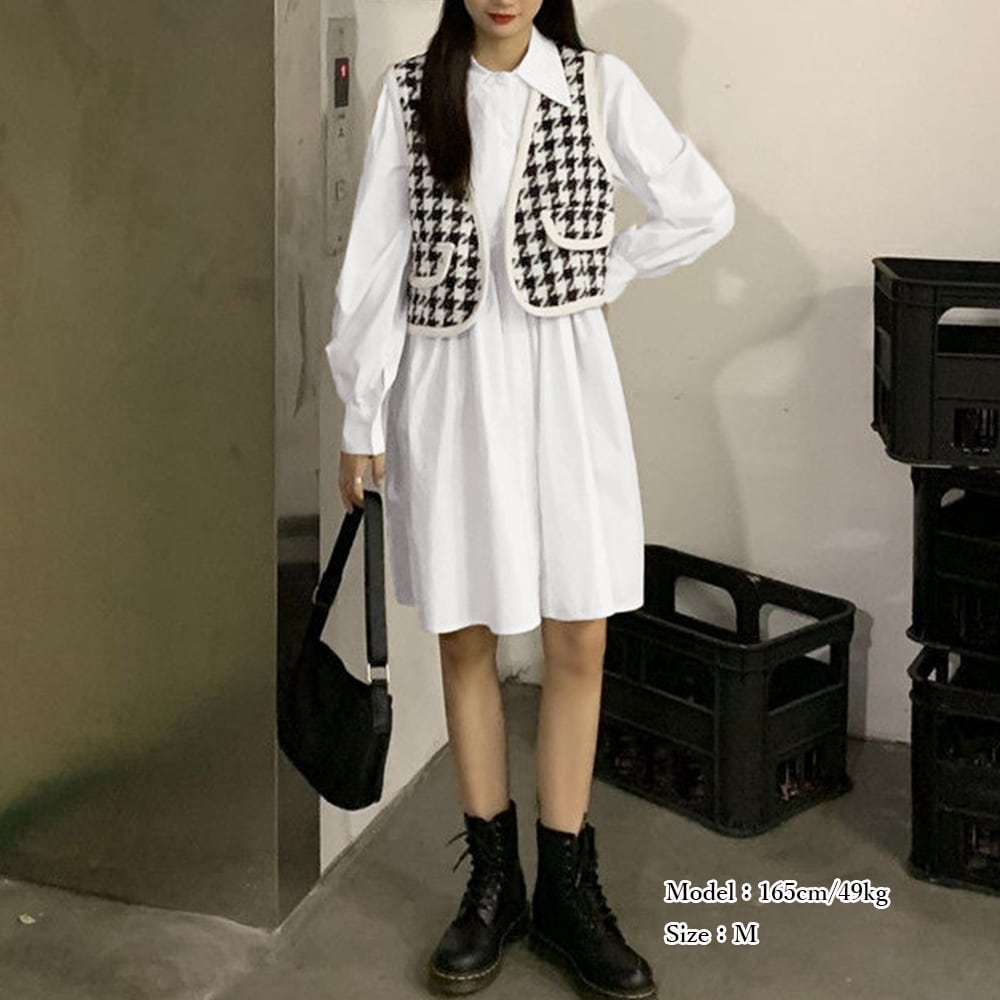 ベスト付き シャツワンピース レディース 春夏秋 きれいめ かわいい 大人 おしゃれ カジュアル 清楚 上品 千鳥柄 大人可愛い 大人女子