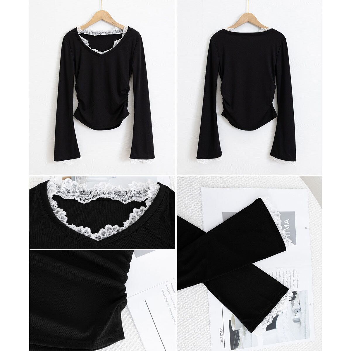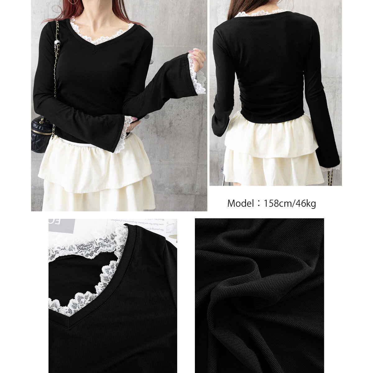 程よいフィット感と華奢見えのサイドギャザーデザインで、体のラインを美しく演出してくれる長袖のレース付きTシャツです。