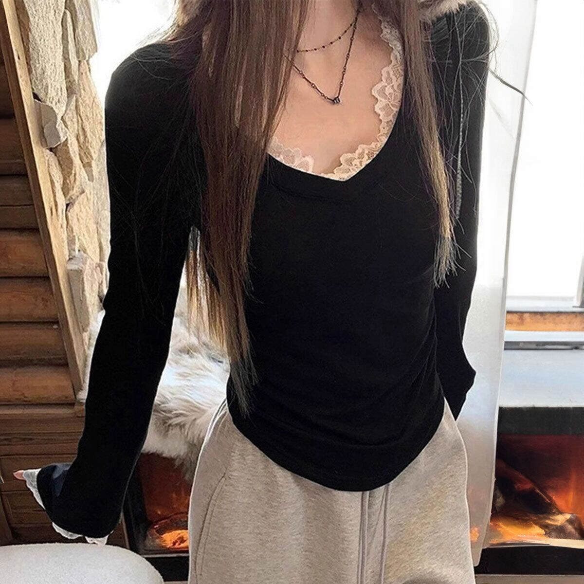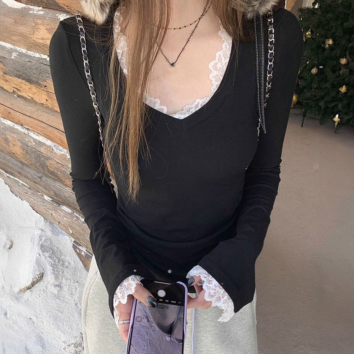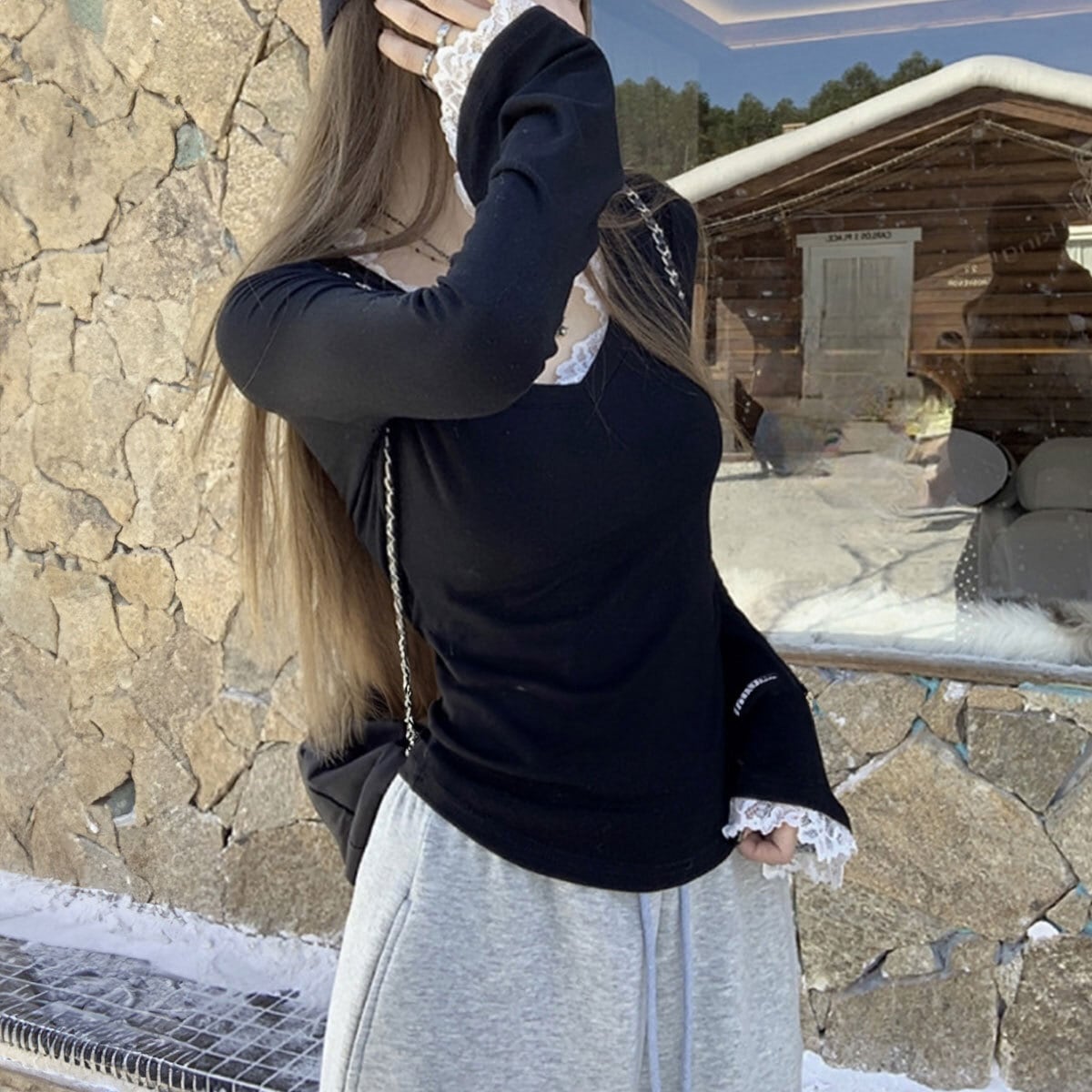 ◇韓国風トレンド感が抜群のレース使いの長袖Tシャツ。