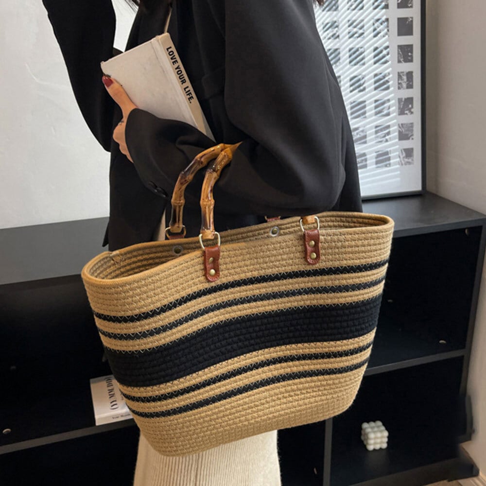 高級感のあるバンブー風のハンドルがお洒落のアクセントになって、コーデを洗練された大人のサマースタイルに仕上げてくれます。
