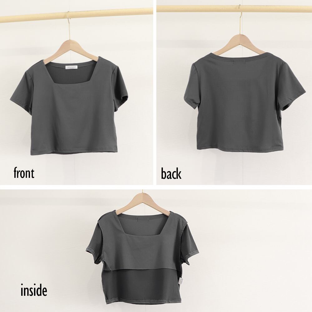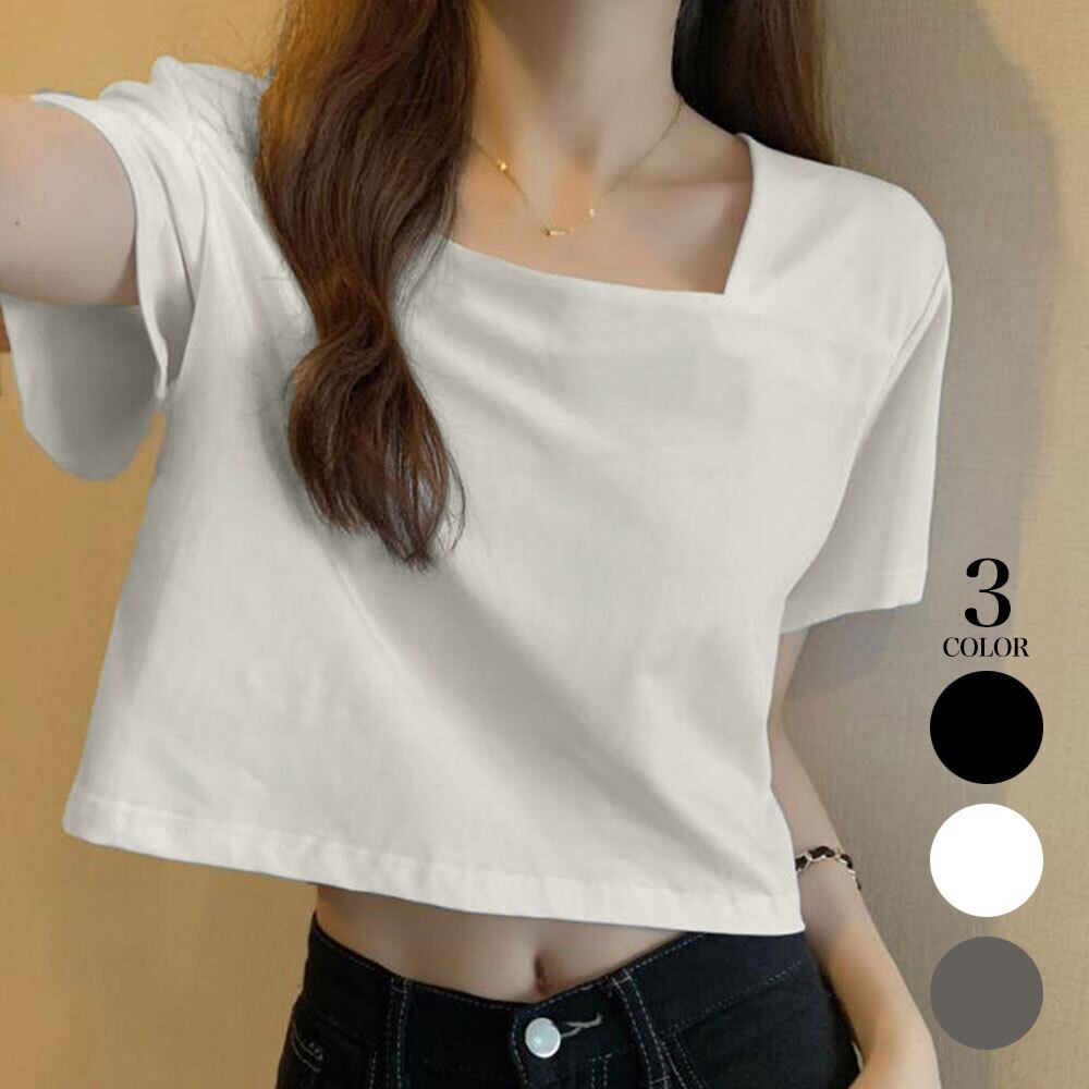 顔周りをすっきり見せてくれるスクエアネックのデザインで、スタイリッシュな大人女子コーデでお洒落を楽しんでいただけるショート丈の半袖Tシャツです。