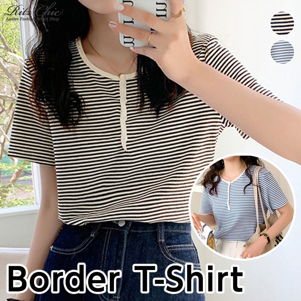 ボーダー Tシャツ 半袖 レディース 春夏秋 韓国 おしゃれ きれいめ 大人 かわいい カジュアル レトロ ヘンリーネック ニットソー 大人可愛い 大人女子