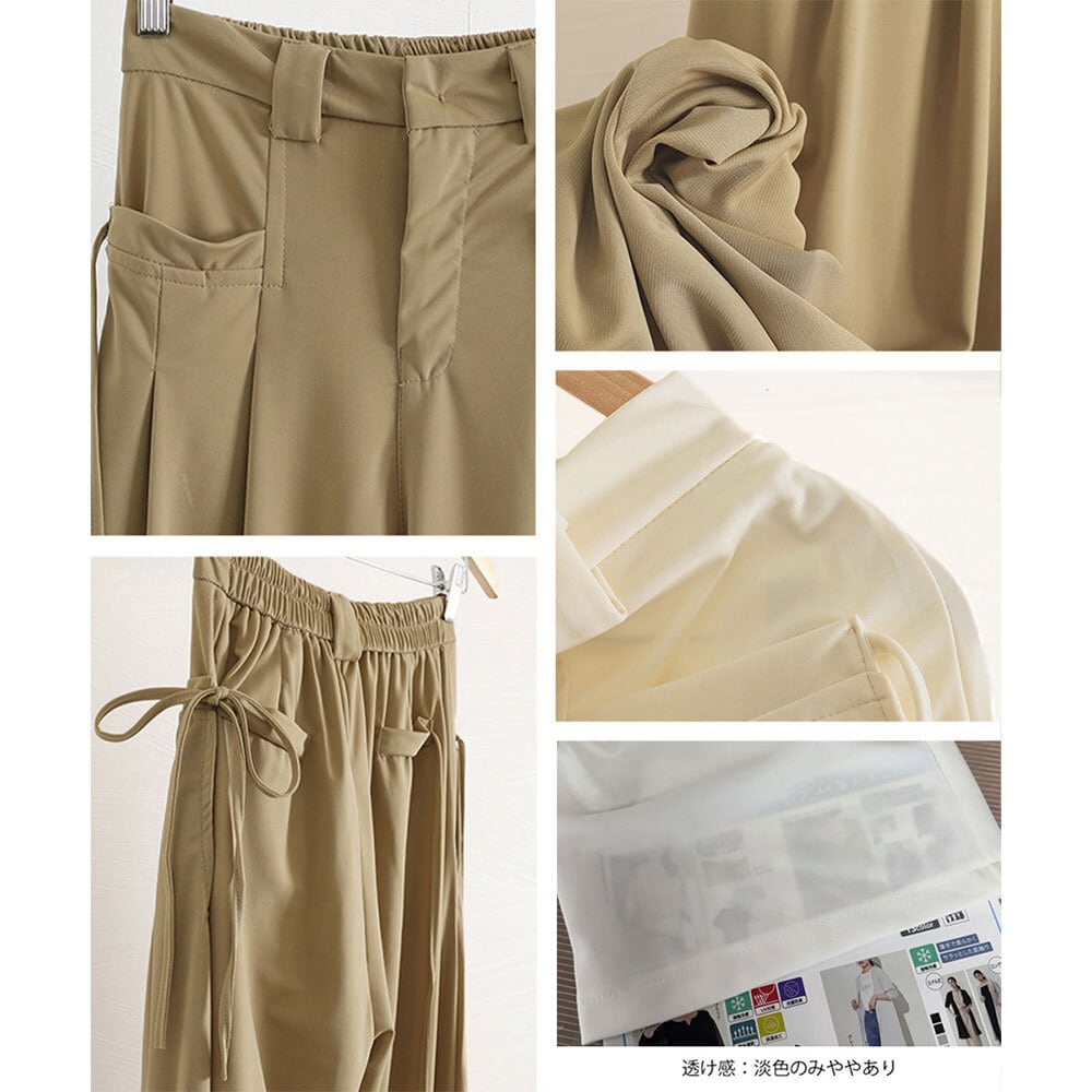 ドレープ加工が施された柔らかい生地素材で、軽やかな穿き心地とリラックス感が魅力的なレディースのワイドパンツです。