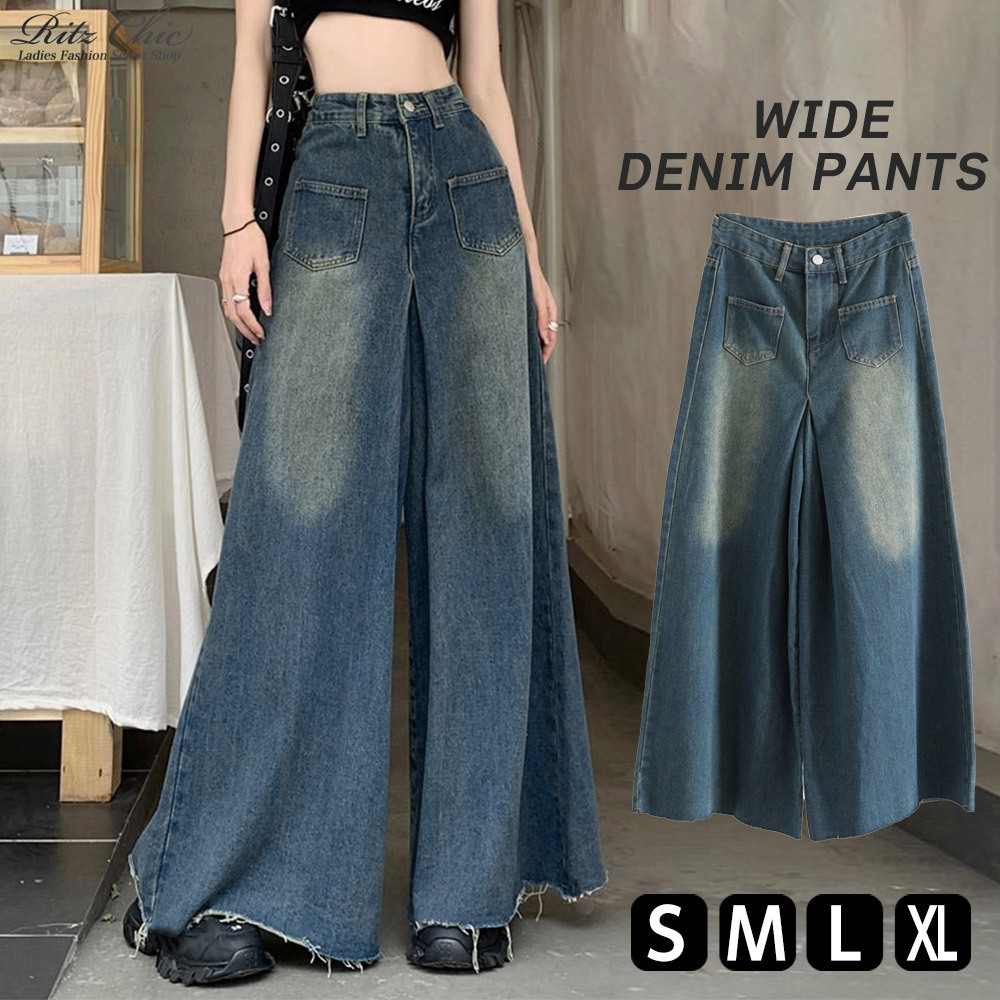 ワイド ジーンズ フレア デニムパンツ レディース 韓国 大人 カジュアル おしゃれ レトロ ユーズド加工 ヴィンテージ ゆったり ハイウエスト バギーパンツ 大人可愛い 大人女子