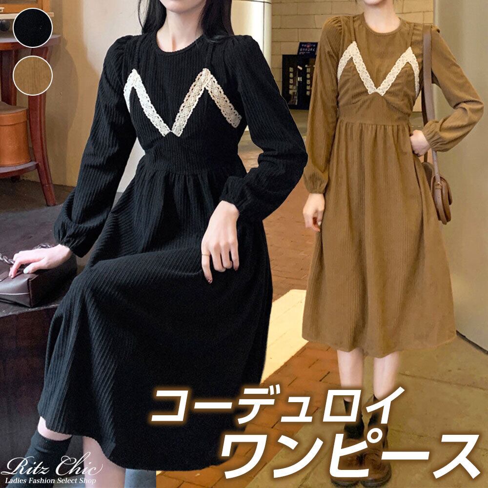 ロングワンピース コーデュロイ 長袖 レディース 秋冬 韓国 ワンピース きれいめ 大人 かわいい おしゃれ Aライン 厚手 レトロ ハイウエスト 大人可愛い 大人女子