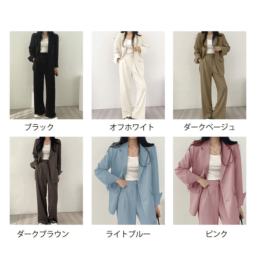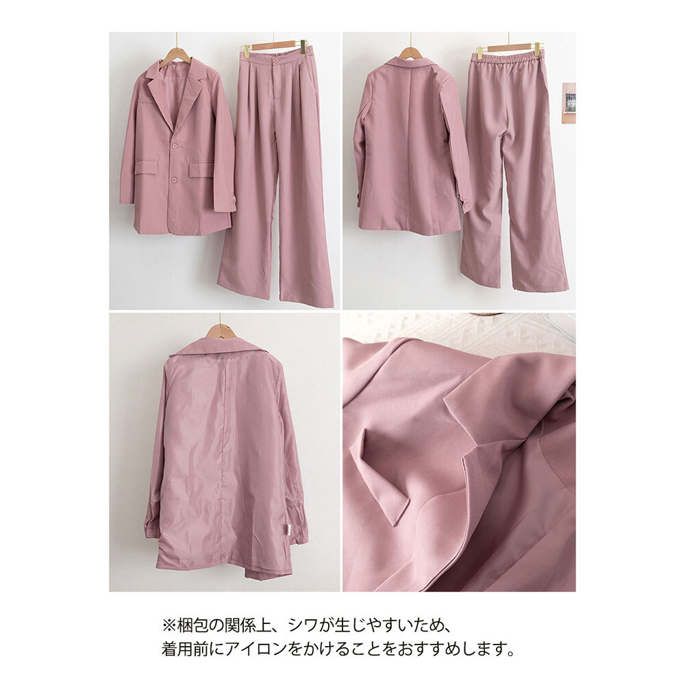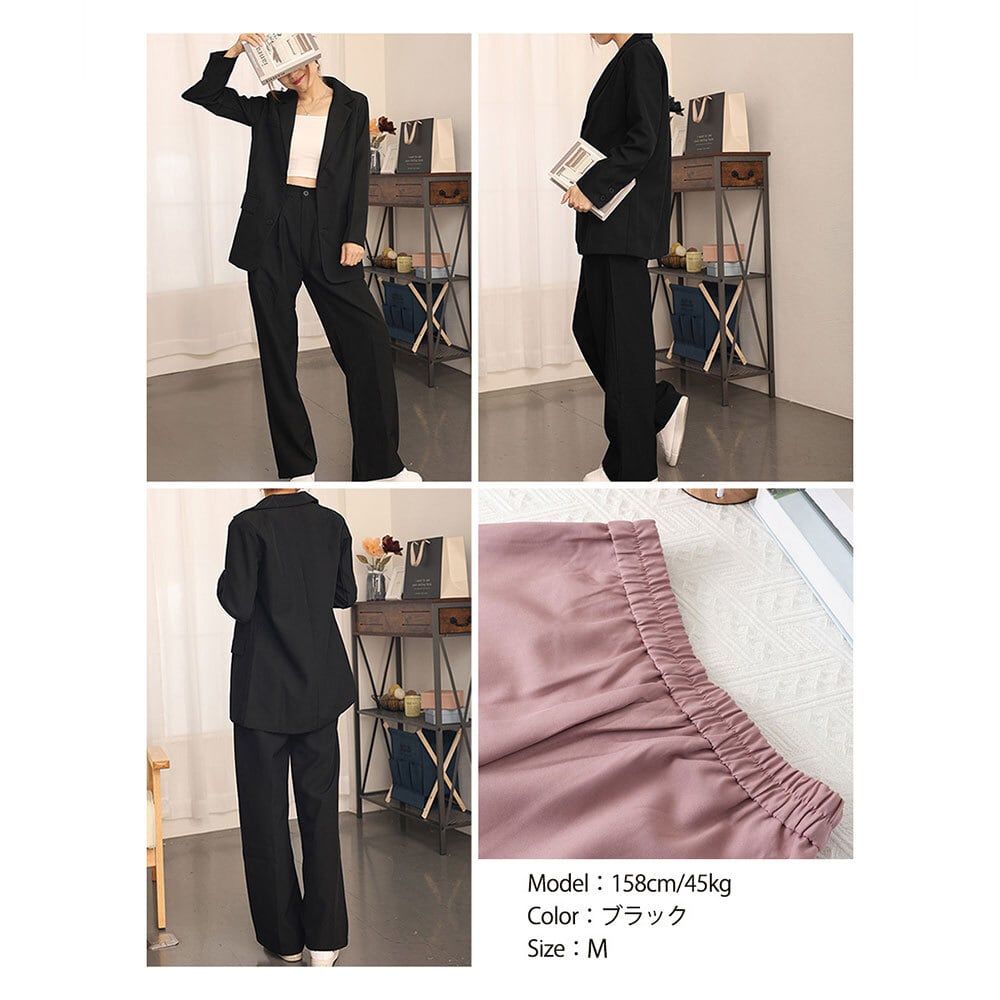 きれいめなデザインのテーラードジャケットと、タック入りのワイドパンツがセットになった通勤やオフィス、ビジネスシーンに大活躍してくれるスーツスタイルのセットアップです。