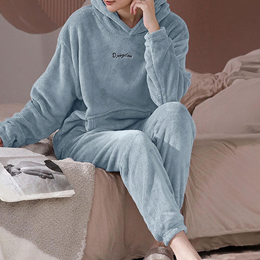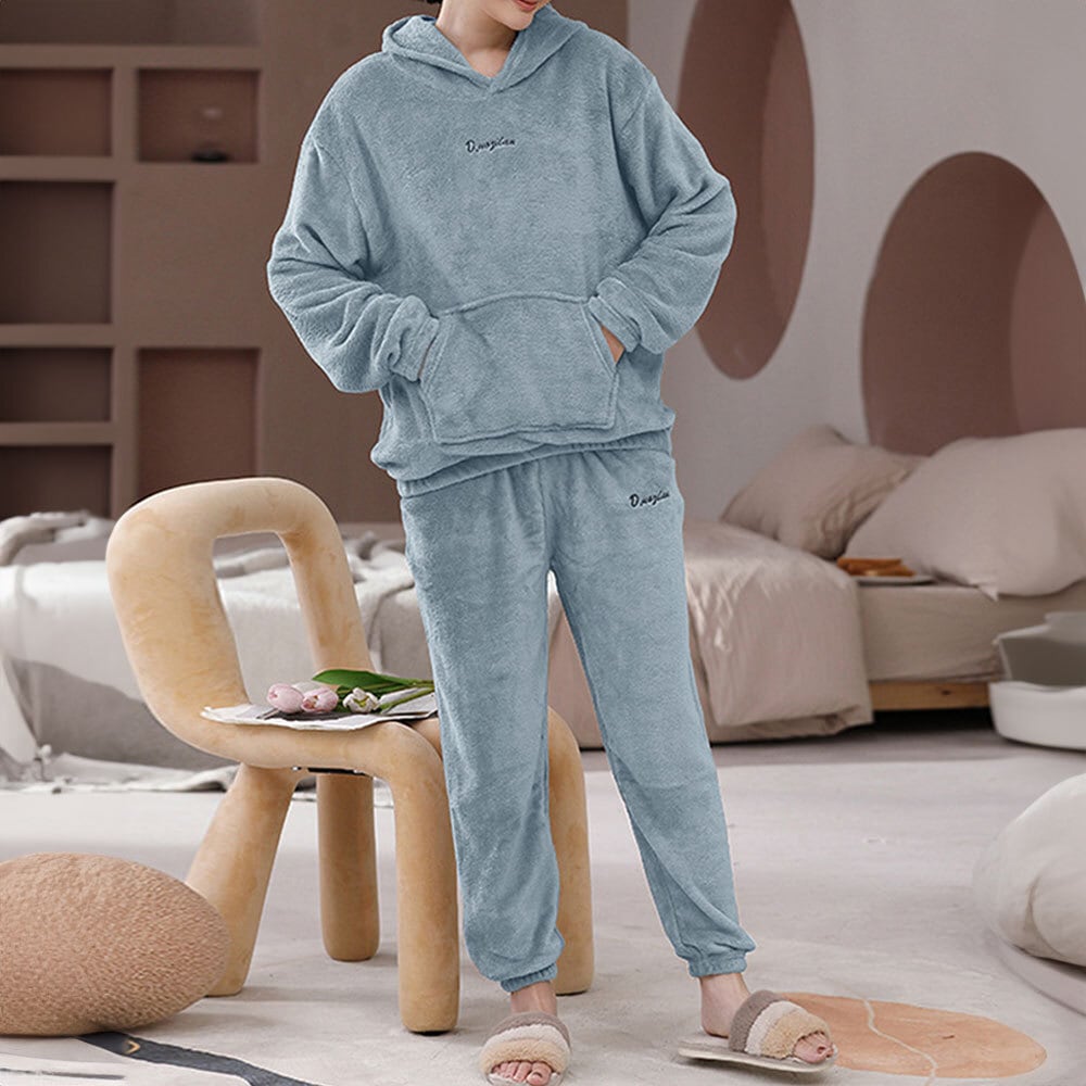 フード付きのパーカートップスとロングパンツのセットになっていて、コーデに悩む事なく合わせるだけで秋冬らしいお洒落が完成してくれます。