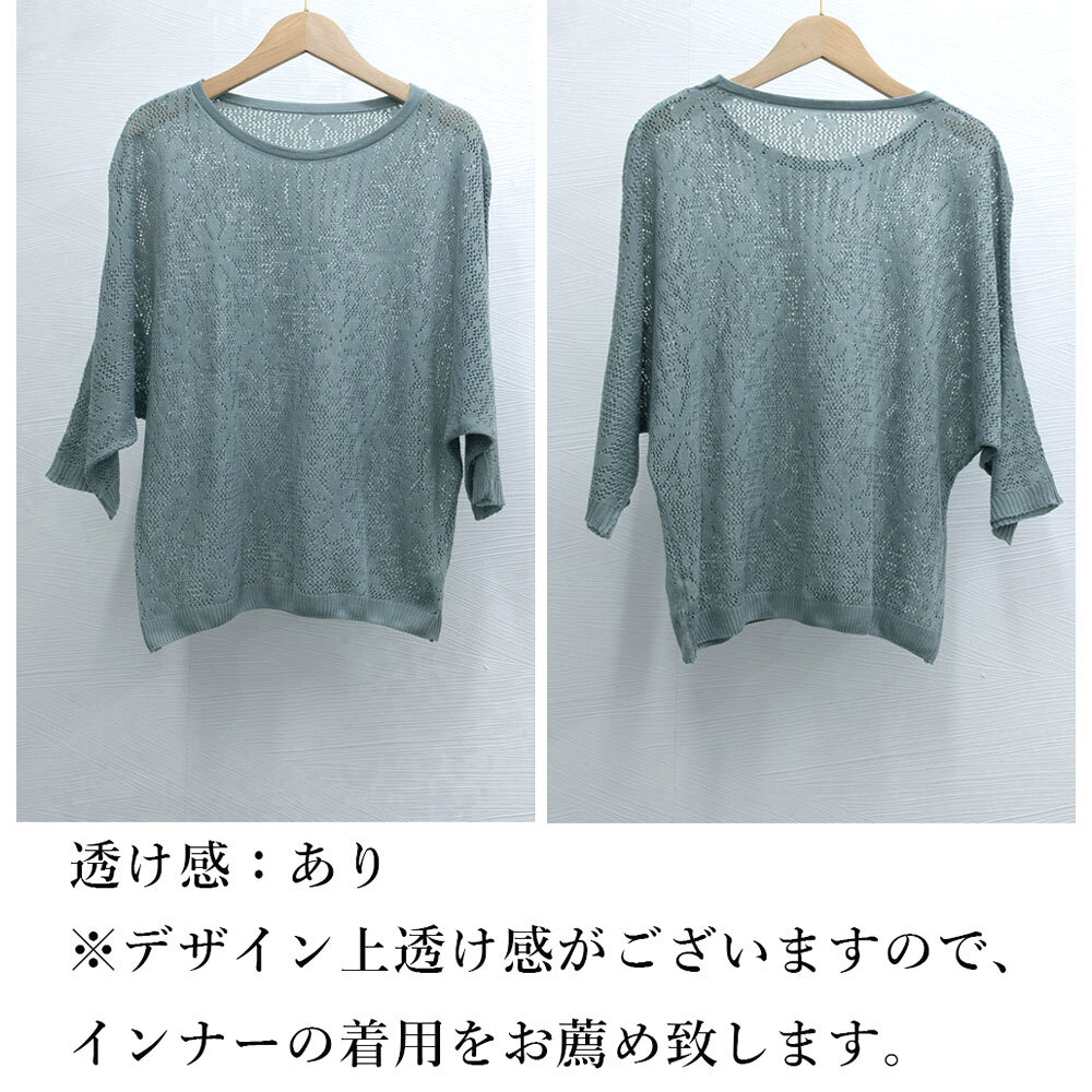 ゆったりとしたサイズ感で春夏の重ね着にぴったりな、ドルマンスリーブの透かし編みニットトップスです。