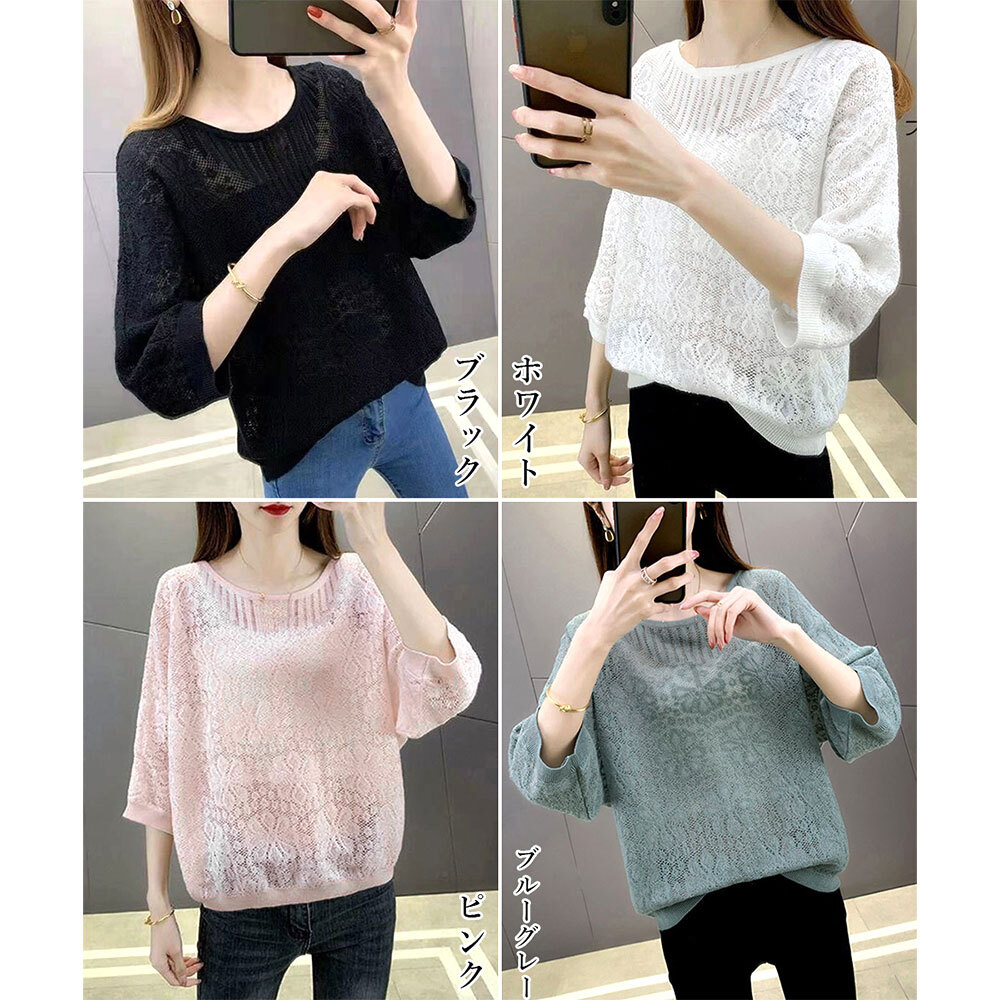 透かし編み ニット トップス レディース 韓国 春夏 透け感 きれいめ おしゃれ 重ね着 大人 かわいい 七分袖 サマーニット 体型カバー ゆったり 大人可愛い 大人女子