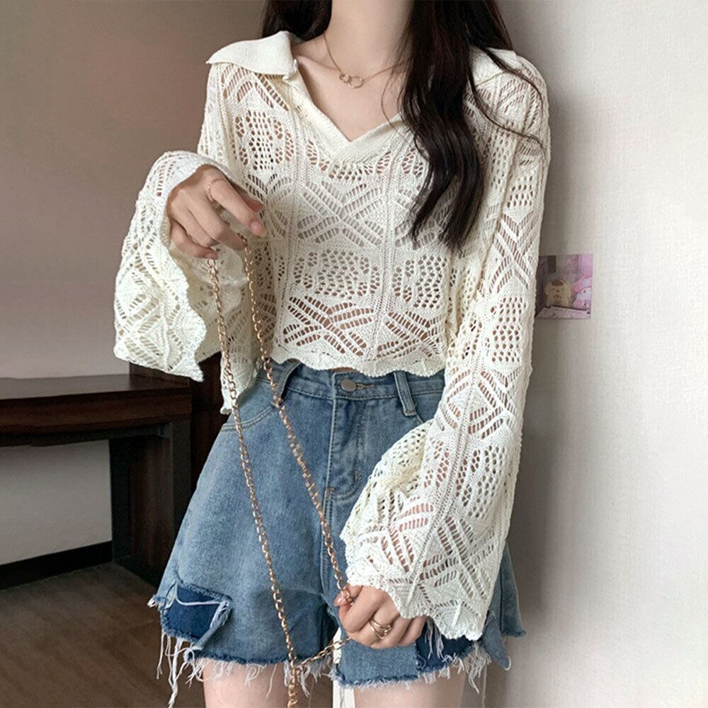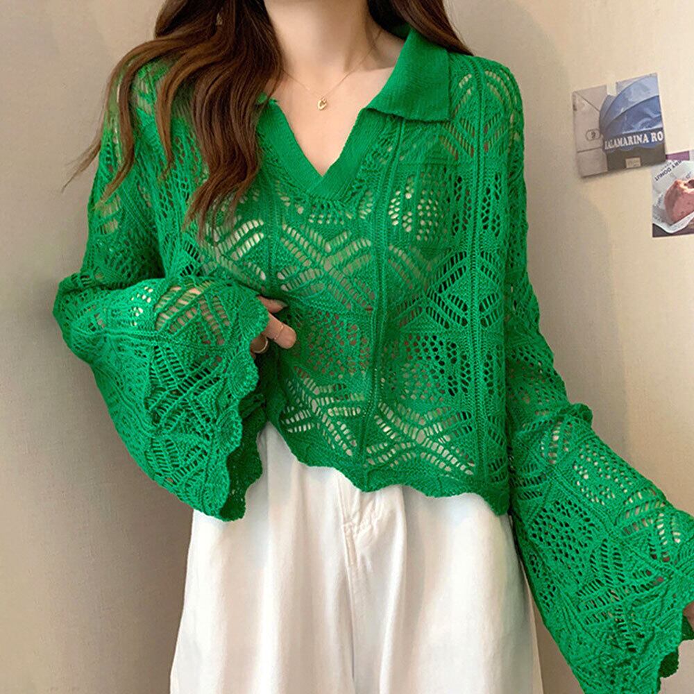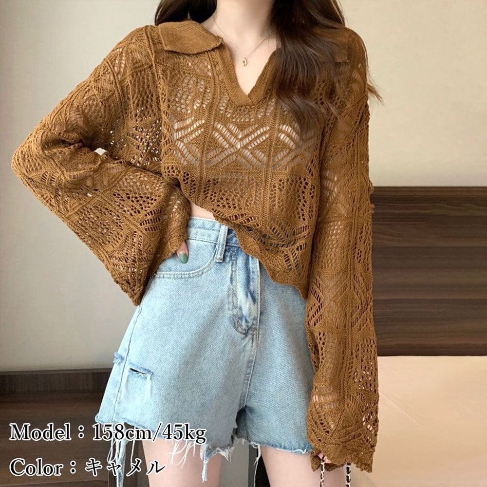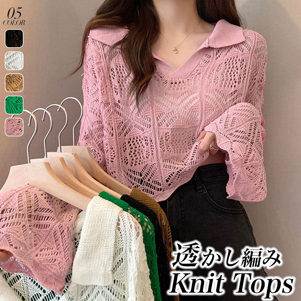 透かし編み ニット レディース 韓国 トップス 春夏秋 重ね着 おしゃれ きれいめ 大人 かわいい カジュアル ゆったり ベルスリーブ 透け感 長袖 大人可愛い 大人女子