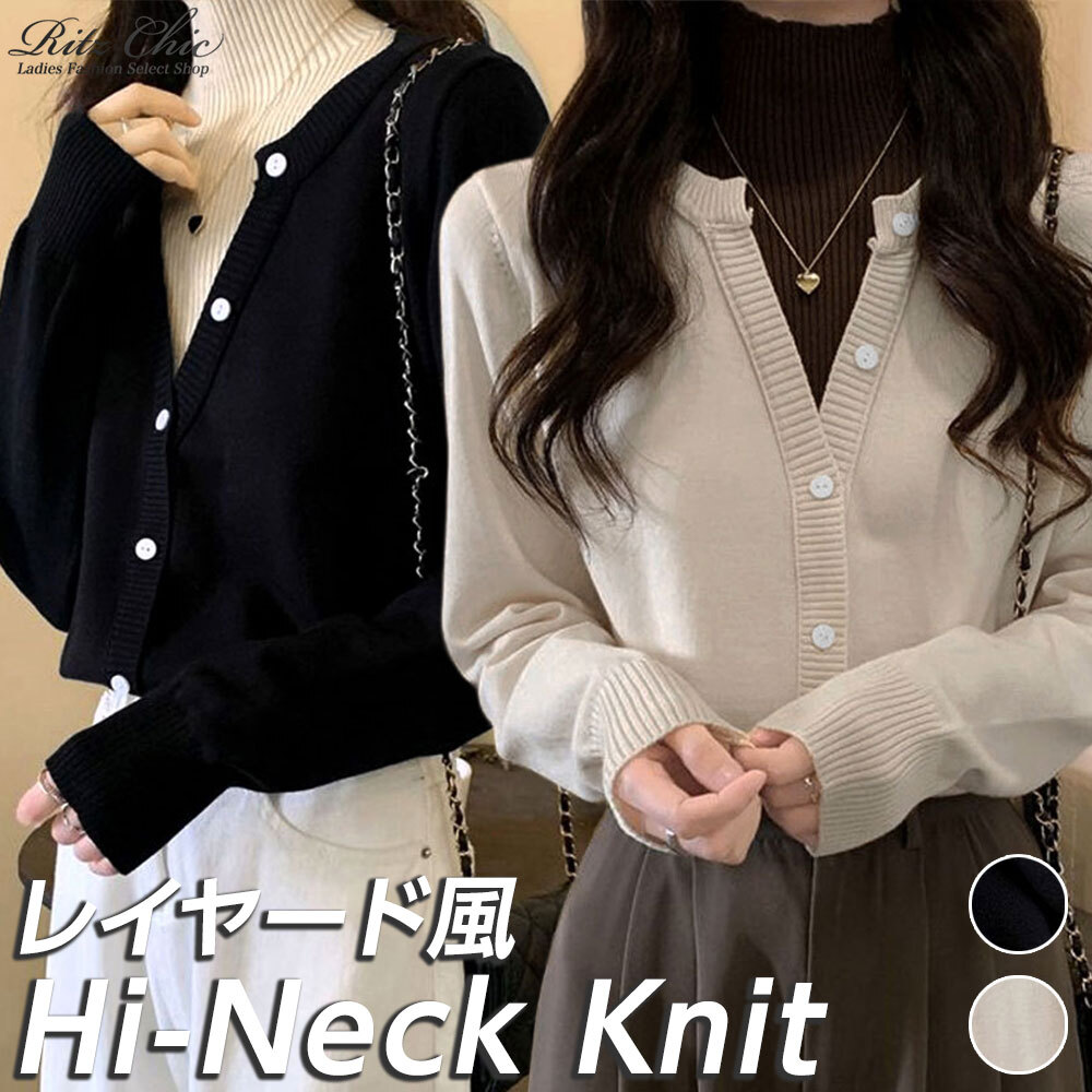 ハイネック 長袖 ニット 重ね着風 レディース 春秋冬 韓国 レイヤード セーター きれいめ 大人 カジュアル バイカラー おしゃれ リブニット シンプル 大人可愛い 大人女子