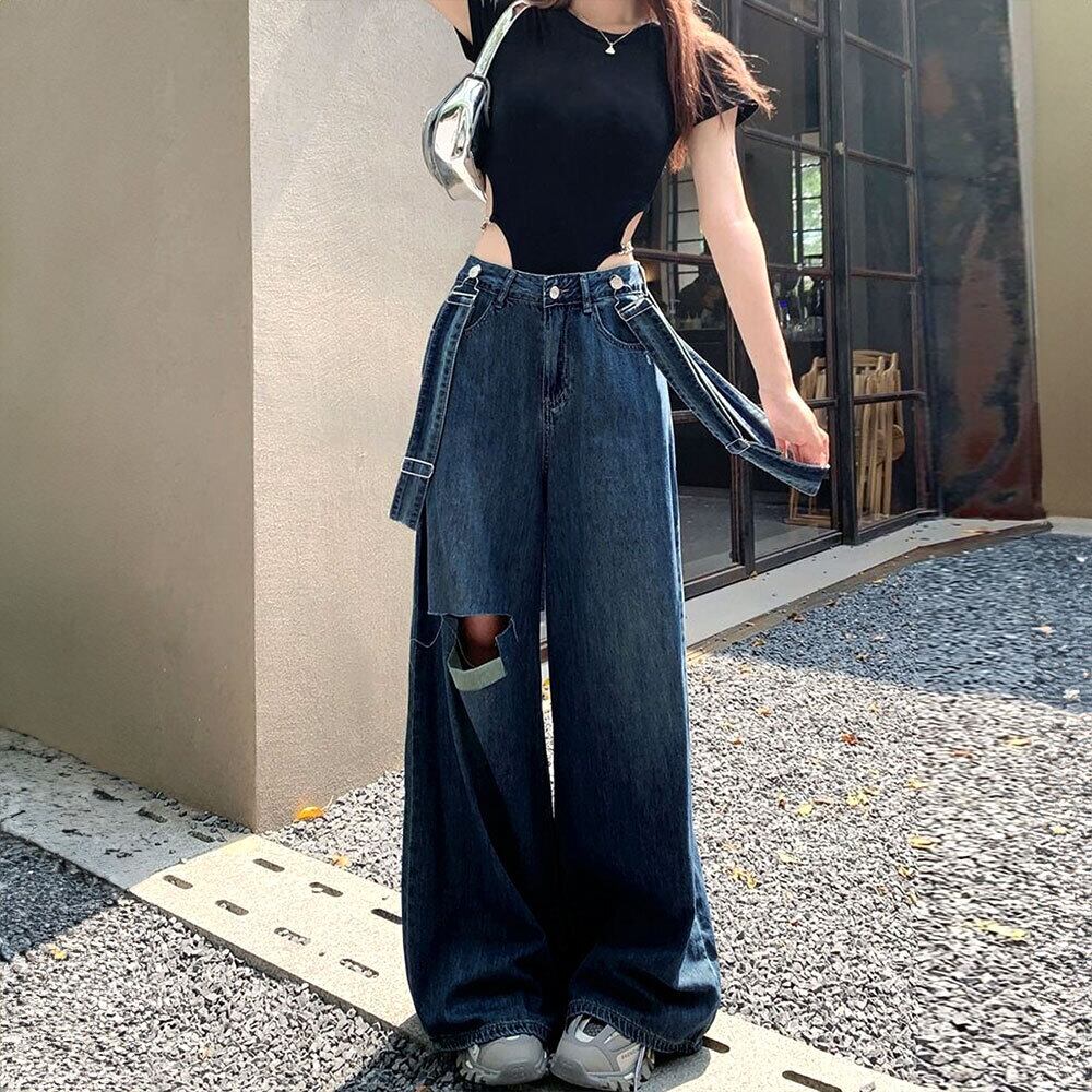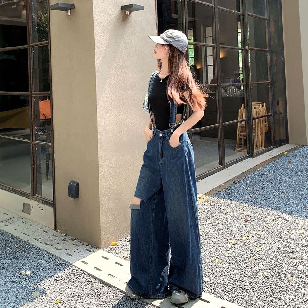 ダメージ デニムパンツ レディース ワイド ジーンズ 韓国 サスペンダー付き デニム カジュアル ストリート 原宿系 アメカジ 大人可愛い 大人女子