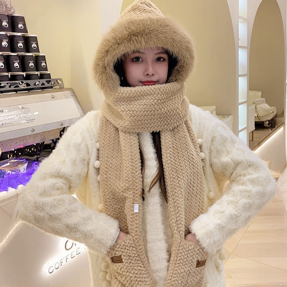エンボスデザインのニット帽と、マフラー、手袋が一体化した個性的で可愛いファーハットです。