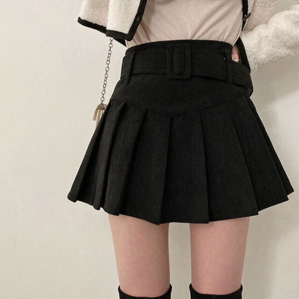 コーデュロイ ミニスカート レディース 秋冬 プリーツ 大人 かわいい おしゃれ 韓国 きれいめ ハイウエスト ベルト付き Aライン インナーパンツ付き 大人可愛い 大人女子