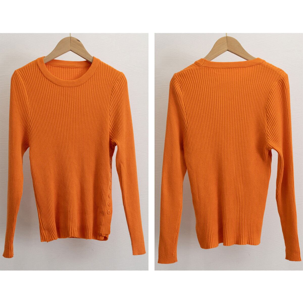 女性らしいシルエットを引き立てるリブニットトップスに、サイドボタンを施して、まるでスリット入りのトップスのようなデザインに仕上げた、長袖のニットセーターです。