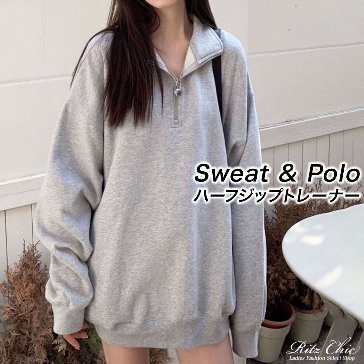 スウェット ハーフジップ シャツ レディース 春秋 韓国 ポロシャツ ストリート 大人 カジュアル シンプル おしゃれ ゆったり チュニック ロンT ドロップショルダー 大人可愛い 大人女子