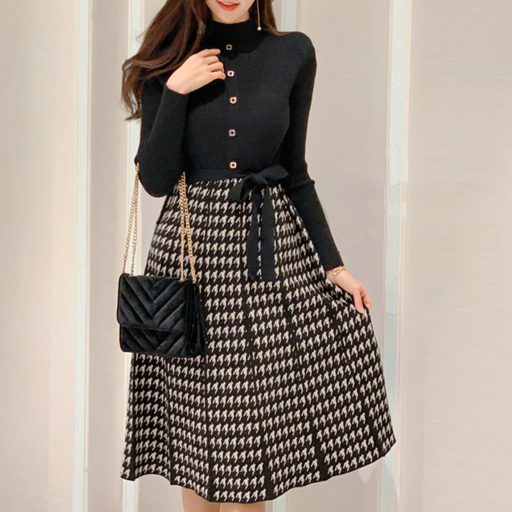 ニット ワンピース 長袖 千鳥格子柄 レディース 秋冬 韓国 きれいめ 大人 かわいい おしゃれ 上品 清楚 プチハイネック ウエストマーク 長袖ワンピース 切り替えデザイン セットアップ風 大人可愛い 大人女子
