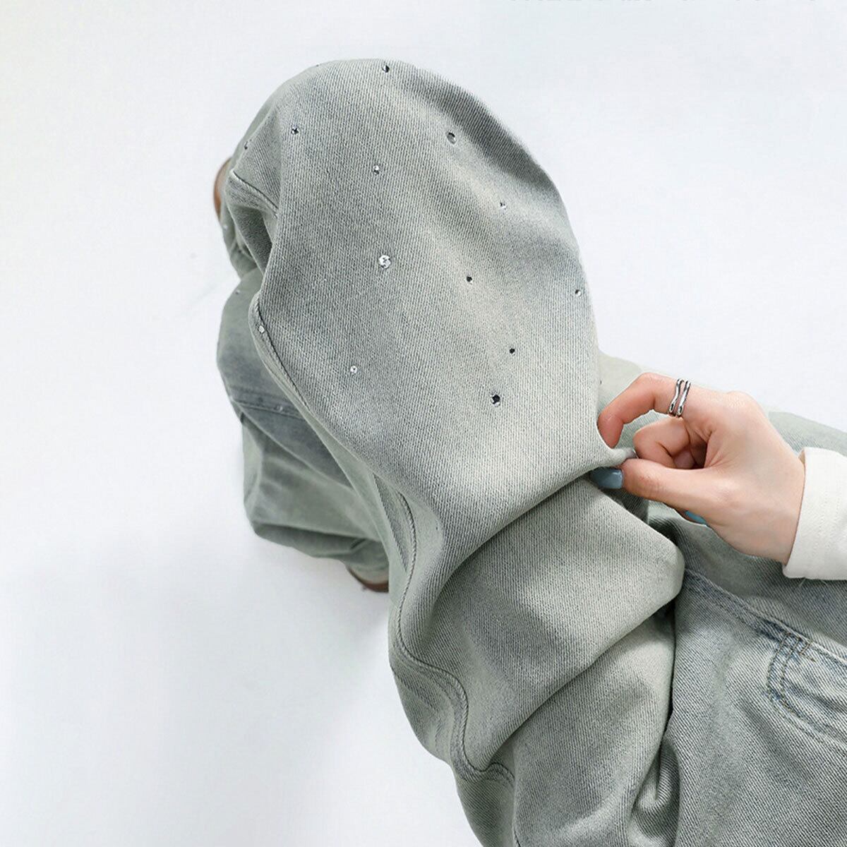 デニムの洗練された雰囲気と、キラリと輝くラインストーンが絶妙に組み合わさり、周りの目を惹いて特別なお洒落さを感じさせてくれます。